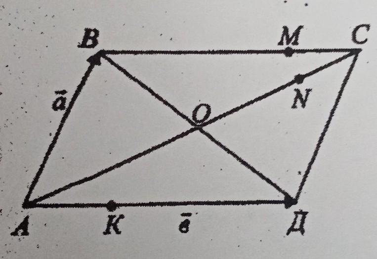 АВСД - параллелограмм, О - точка пересечения диагоналей. Выразите через векторы a= АВ и b= АД вектор MN, где - точка на диагонали АС, такая, что ON= NC.