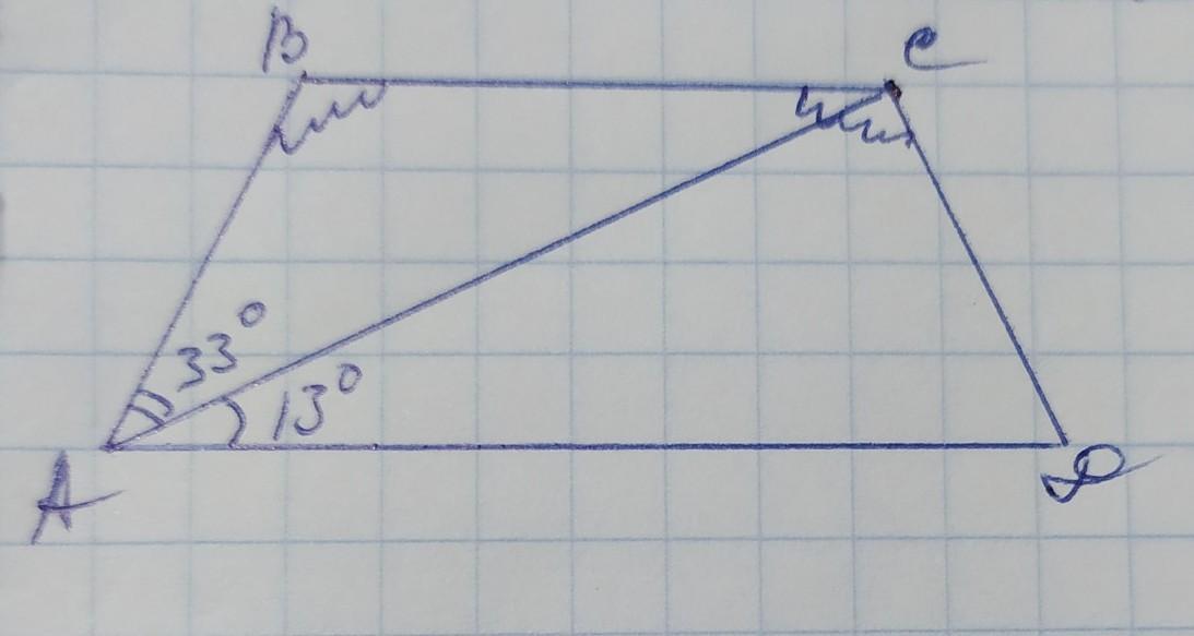 найдите больший угол равнобедренной трапеции авсд если диагональ ас образует основание ад и боковой стороной ав углы равные 33 и 13 соответственно ответ дайте в градусах