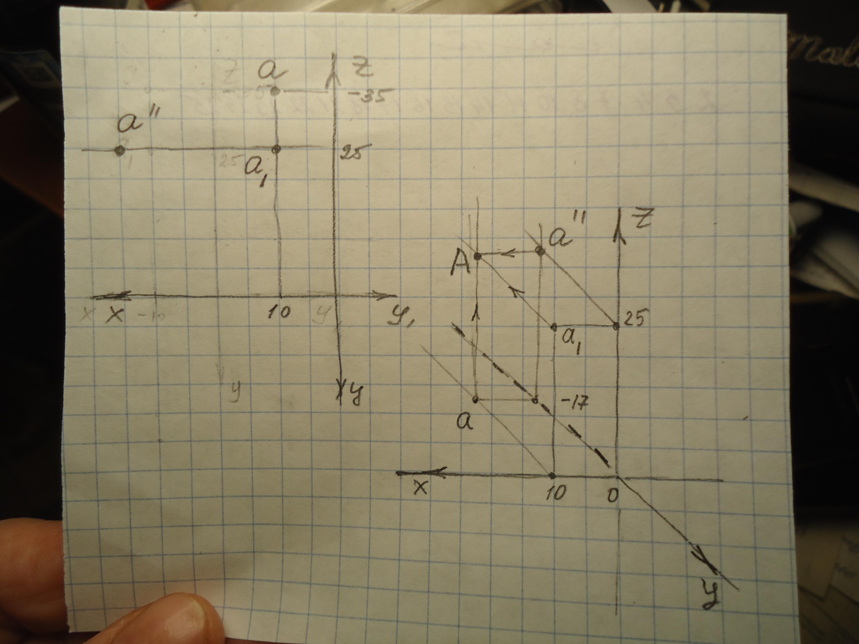 При построении положения в пространстве я применила изображение точки в косоугольной диметрической проекции. При этом по оси ОУ надо отступать расстояние в два раза меньше натурального.