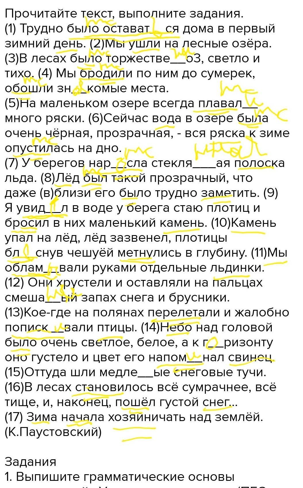 (7) У берегов нар__сла стекля___ая полоска льда. (8)Лёд был такой прозрачный, что даже (в)близи его было трудно заметить. (9) Я увид__л в воде у берега стаю плотиц и бросил в них маленький камень. (10)Камень упал на лёд, лёд зазвенел, плотицы бл__снув чешуёй метнулись в глубину. (11)Мы облам__вали руками отдельные льдинки. (12) Они хрустели и оставляли на пальцах смеша__ый запах снега и брусники.