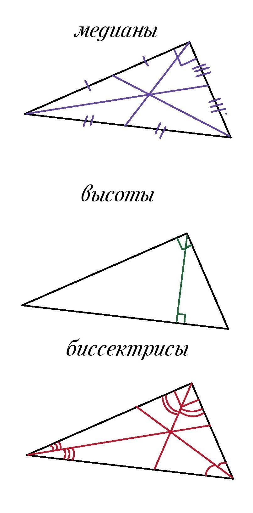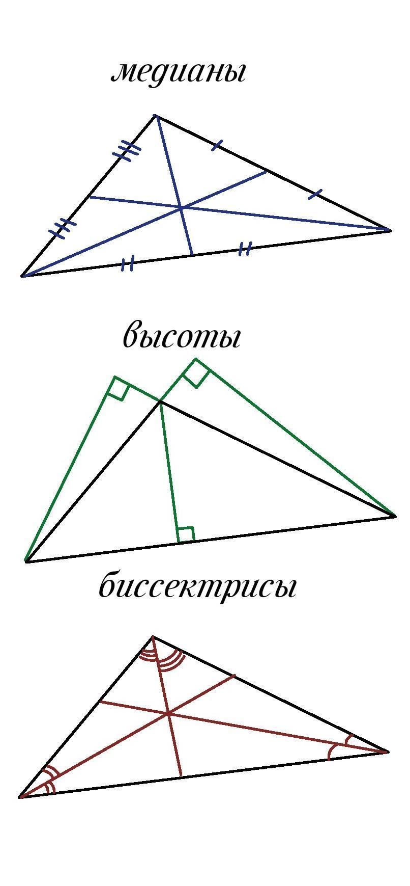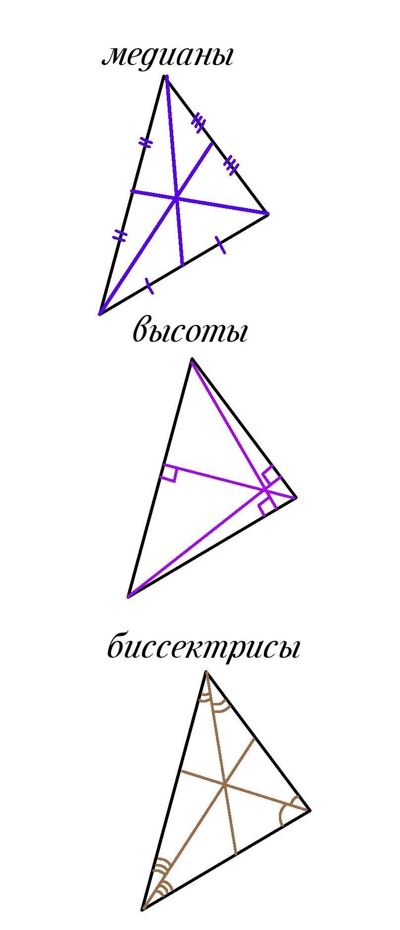 Все медианы, высоты и биссектрисы треугольников. Листайте картинки