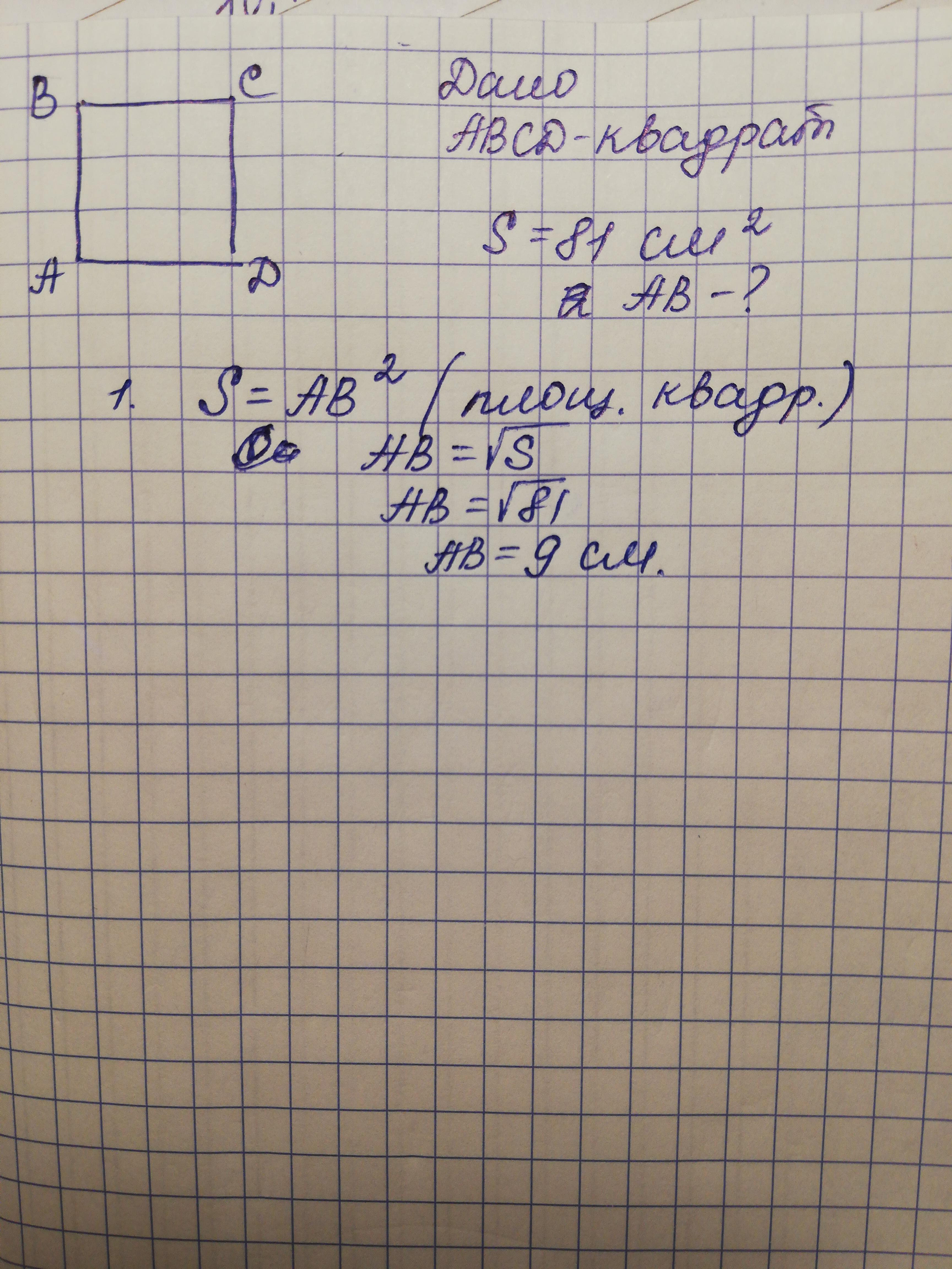Сторона квадрата 9 см так, как S находится по формуле ab.