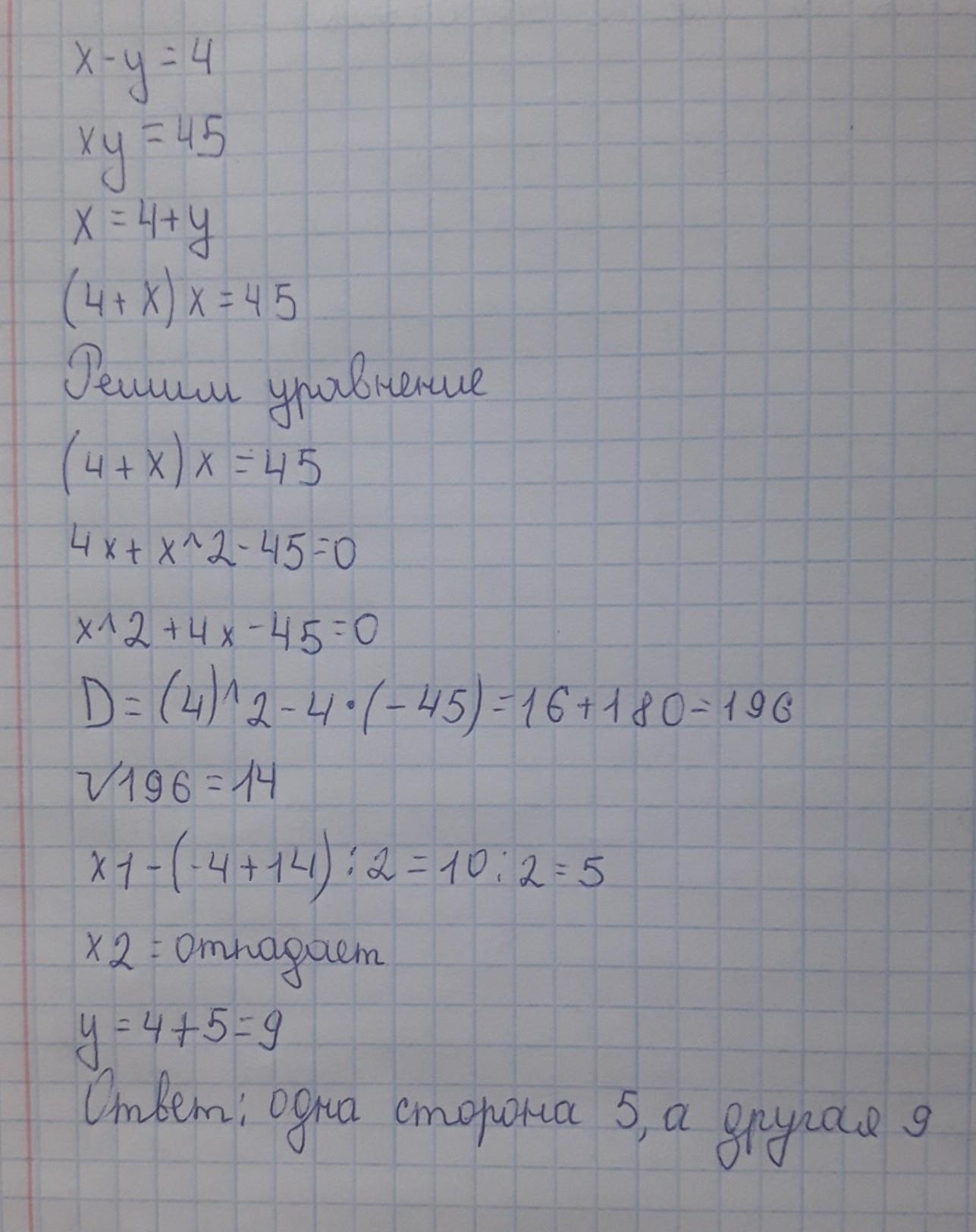 Одна из сторон прямоугольника на 4 м больше другой стороны. Найдите стороны прямоугольника, если его площадь равна 45 м2РЕШИТЕ ПОЖАЛУЙСТА СИСТЕМОЙ