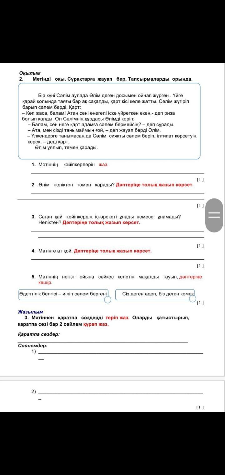3.Маған Сәлімнің іс әрекеті ұнады.Себебі ол қарт атаға өз кішілігіне көрсетіп амандасты. Ал Әлімнің амандаспағаны дұрыс болмады!