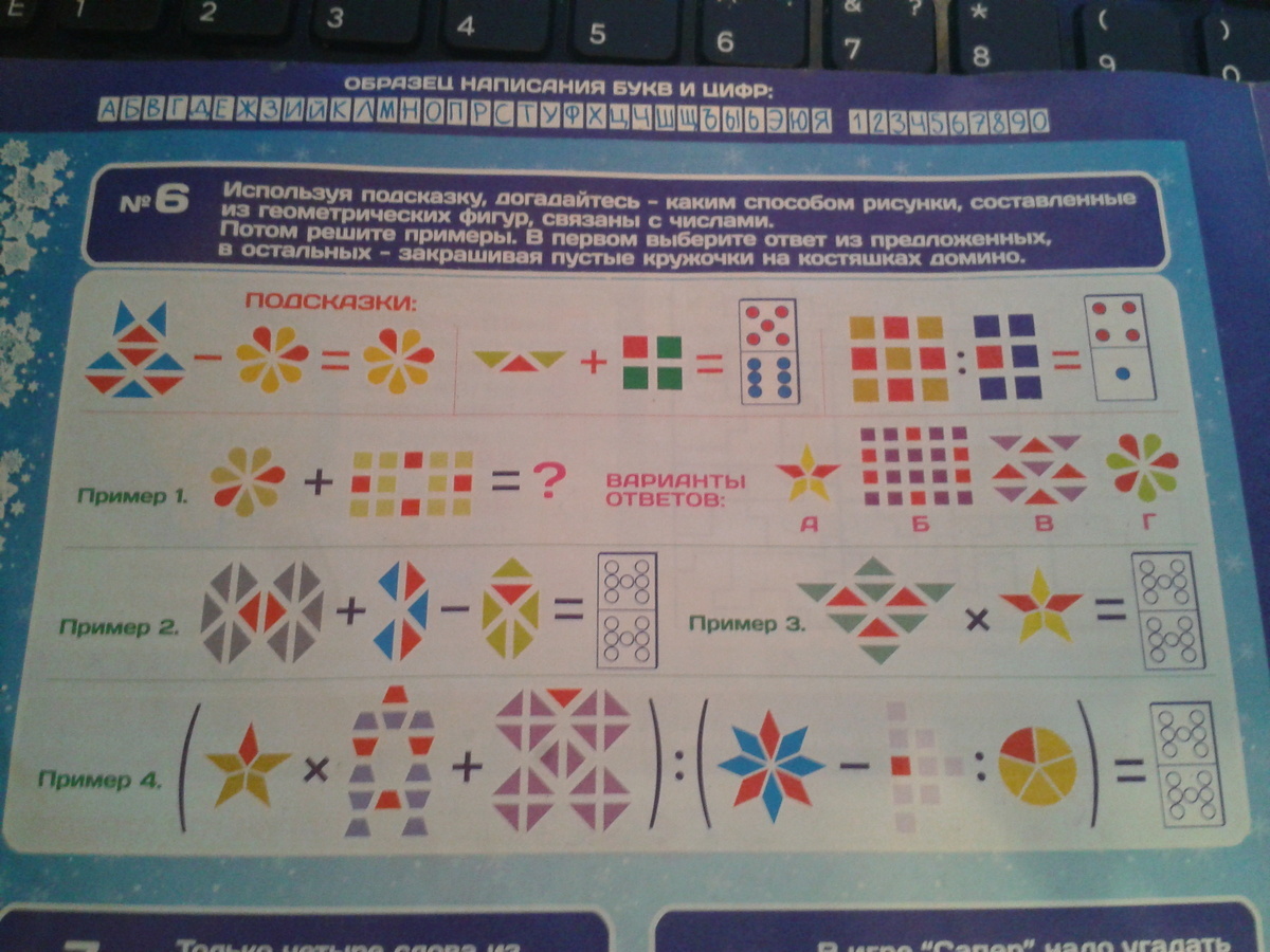 используя подсказку , догадайтесь - каким способом рисунки,составленные из геометрических фигур,связаны с числами. потом решите пример. в первом выберите ответ из предложенных, в остальных- закрашивая пустые кружочки на костяшках домино. СРОЧНО!
