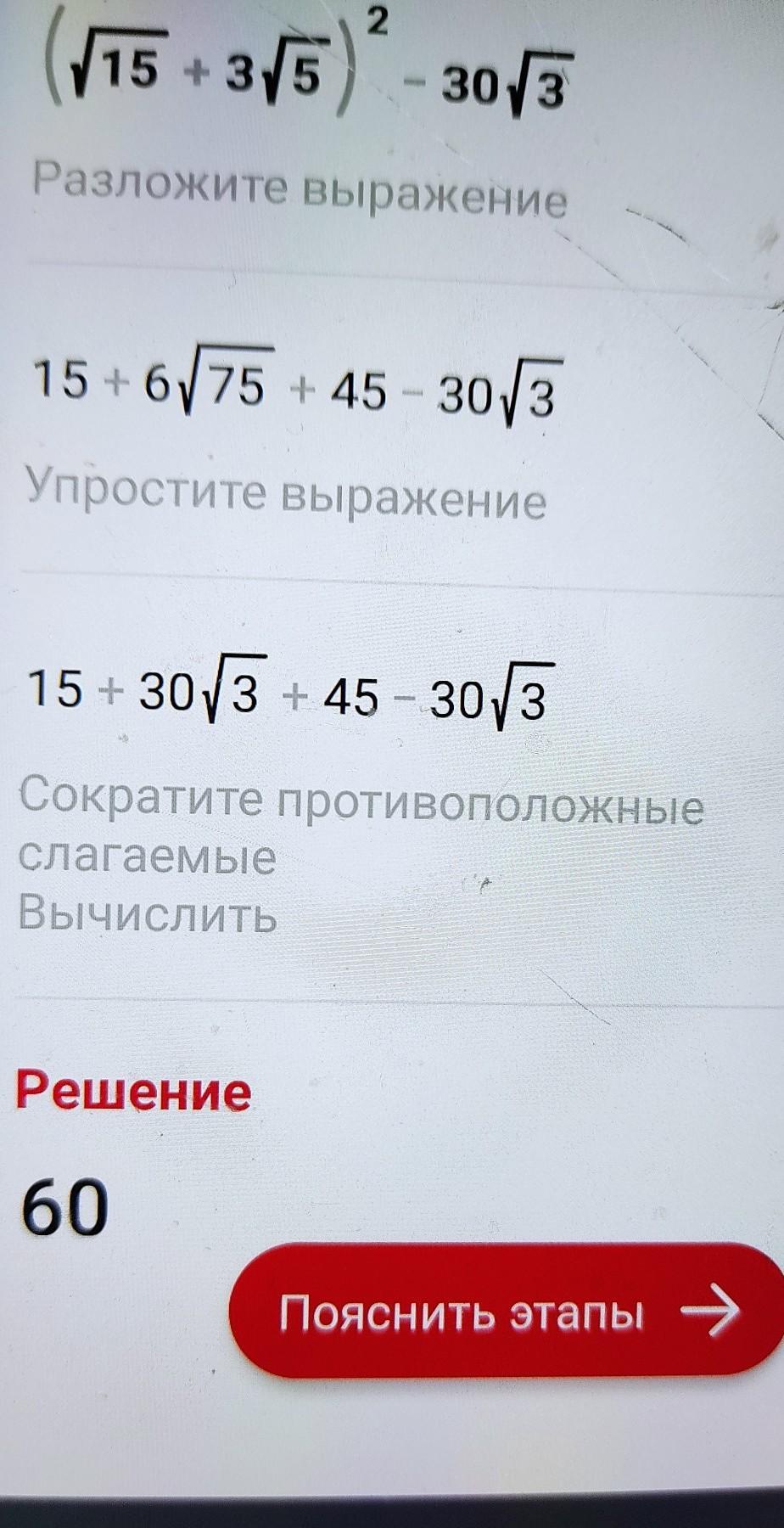 (√15+3√5)²-30√3=15+2*√15*3√5+9*5-30√3=60+30√3-30√3=60