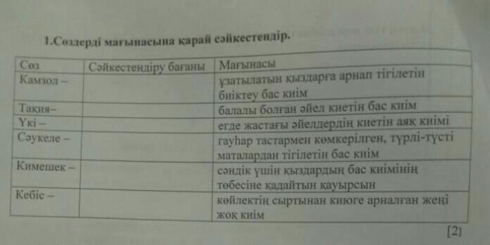 1. Мәтінді оқып , берілген сөздерді мағынасымен сәйкестендіріңіз . Казак әйелдері көйлектің сыртынан камзол киген . Олар көбіне жеңсіз болған . Камзолды баркыттан және басқа маталардан тіккен , оны ілгегі мен ілмегі бар күміс капсырмамен капсырған . Әйелдердің ежелгі сырт киімі - ұзын женді шапан . Бас киімдер әйелдердің отбасы жағдайын білдіретін . Қыздардың бас киімі - кестемен тігілген , төбесіне бір шок үкі тағылатын такия . Үкілі такия - казак кыздарының ерекше ұнатып киетін бас киімі . Қыздардың такиясы қызыл , күлгін , жасыл т.б. түстермен , шұға , баркыт сиякты маталармен тігіледі . Түрлі - түсті моншак - маржан , алтын , күміс теңгелер және асыл тастармен безендірілген . Үкiнiн кауырсынын әсемдік үшін такияның төбесіне кадайды . Бұл казак көне діни ұғымға байланысты үкі құсын « қасиетті кұс » деп санағанынан пайда болған . Тұрмыска шығатын кезде киетін сәукеле - орташа биіктігі 70 см шамасындағы конус тәріздес бас киім . Сәукелеге күміс пластиналар тігіледі . Сондай - ақ кестемен , маржанмен әшекейленеді . Кимешек - тұрмыстағы әйелдің бірінші баланы босанғаннан кейін киетін бас киімі . Әйелдердің аяқ киімі ерлердікінен ерекшеленбеген . Кыздар мен жас келіншектер биік өкшелі етік кисе , кексе әйелдер аласа екшелі киген , бірақ көбіне мәсі және оның сыртынан кебіс кигенді тәуір көрген .