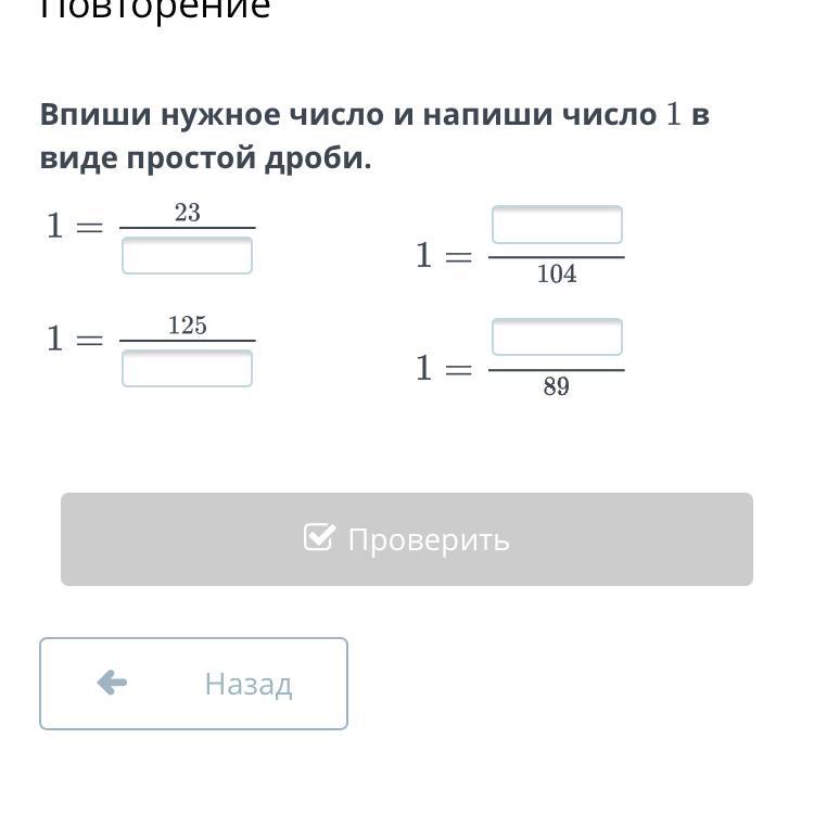 Впиши нужное число и напиши число 1 в виде простой дроби.