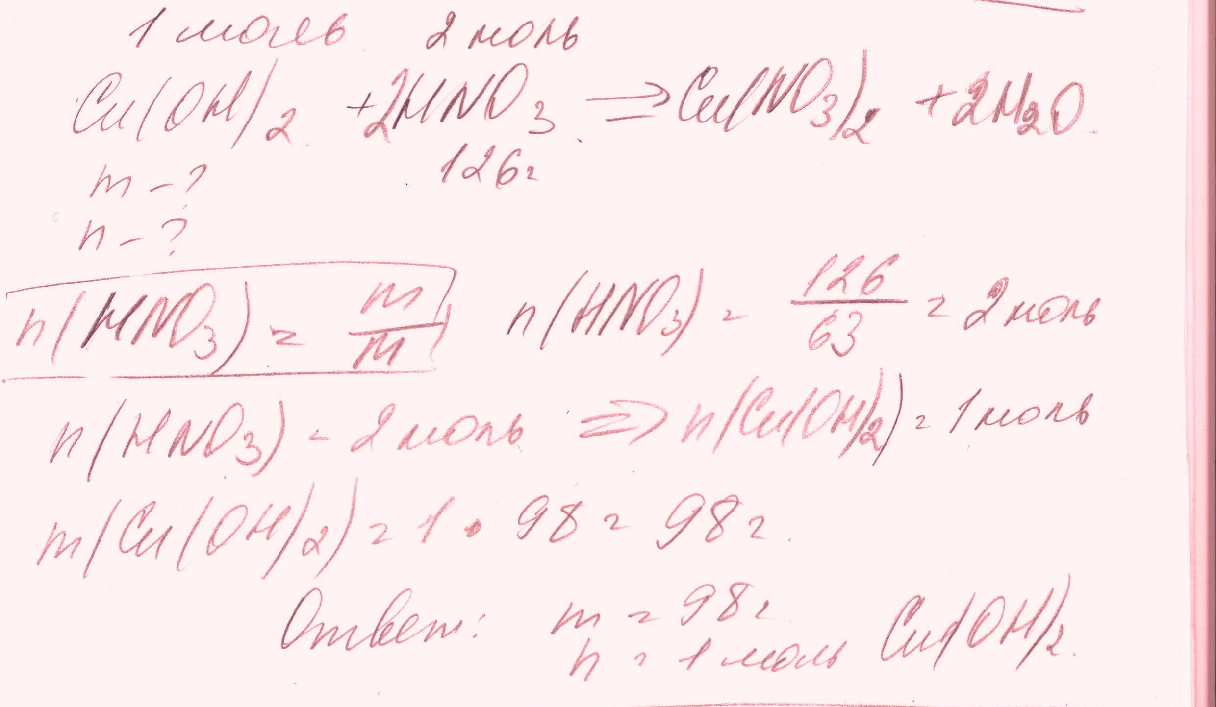 вычислите количество и массу гидроксида меди (||) которым можно нейтрализовать 126 г.азотной кислоты