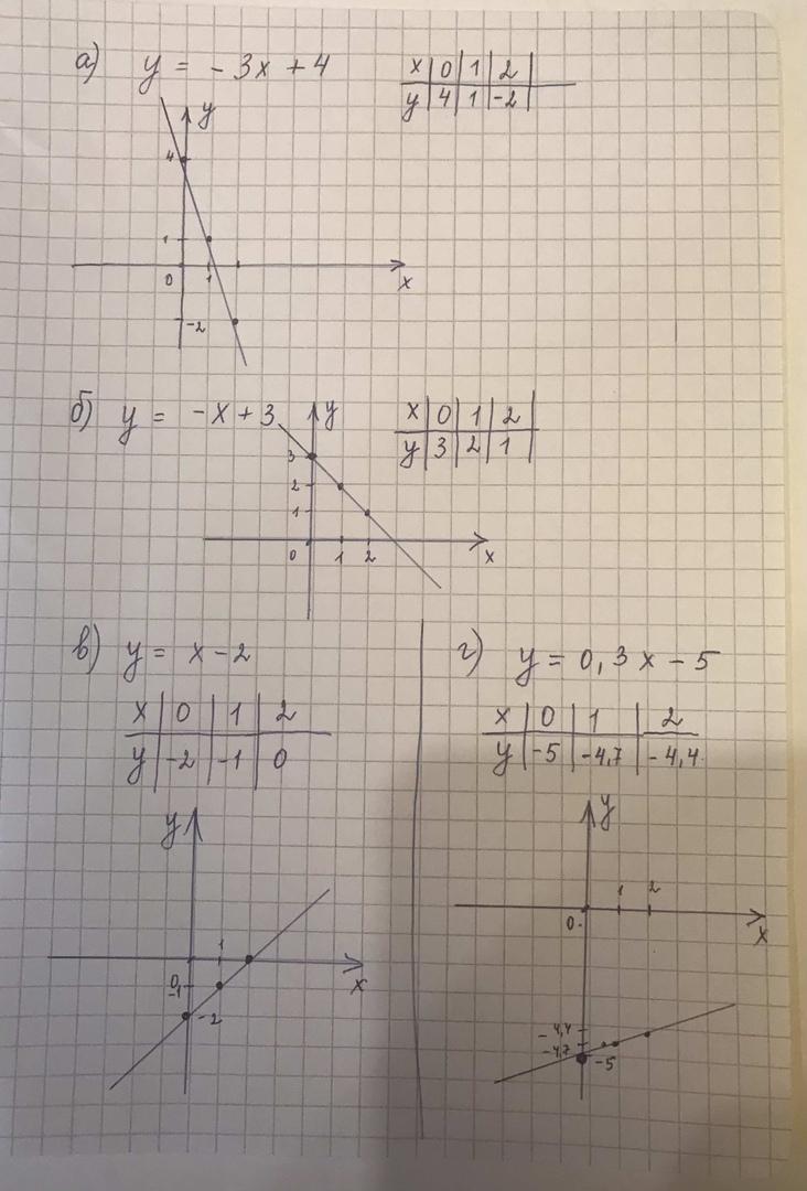постройте график функции, заданной формулой : а) у=-3х+4; б) у=-х+3; в) у=х-2; г) у=0,3х-5;