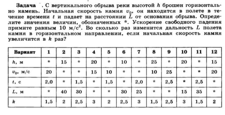 С вертикального обрыва реки высотой h=20 м брошен горизонтально камень. Начальная скорость Камня v0 он находится в полете в течение времени t и падает на расстоянии 15 м от основания обрыва. Определите значение величин, обозначенных *. Ускорение свободного падения примите равным 10 м/с^2. Во сколько раз изменится L полёта камня в горизонтальном направлении, если начальная скорость камня увеличится в 3 раза?