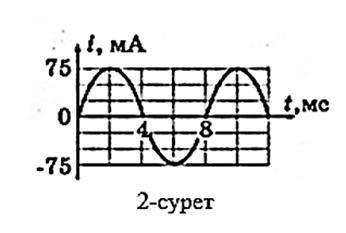 На рисунке 2 показан временной график переменного тока. (i) определить частоту колебаний. [1] (ii) Напишите уравнение для изменения тока с течением времени. [2]