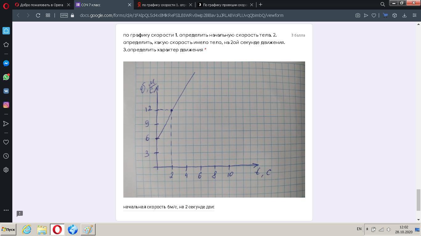 по графику скорости 1. определить начальную скорость тела. 2. определить, какую скорость имело тело, на 2ой секунде движения. 3.определить характер движения *