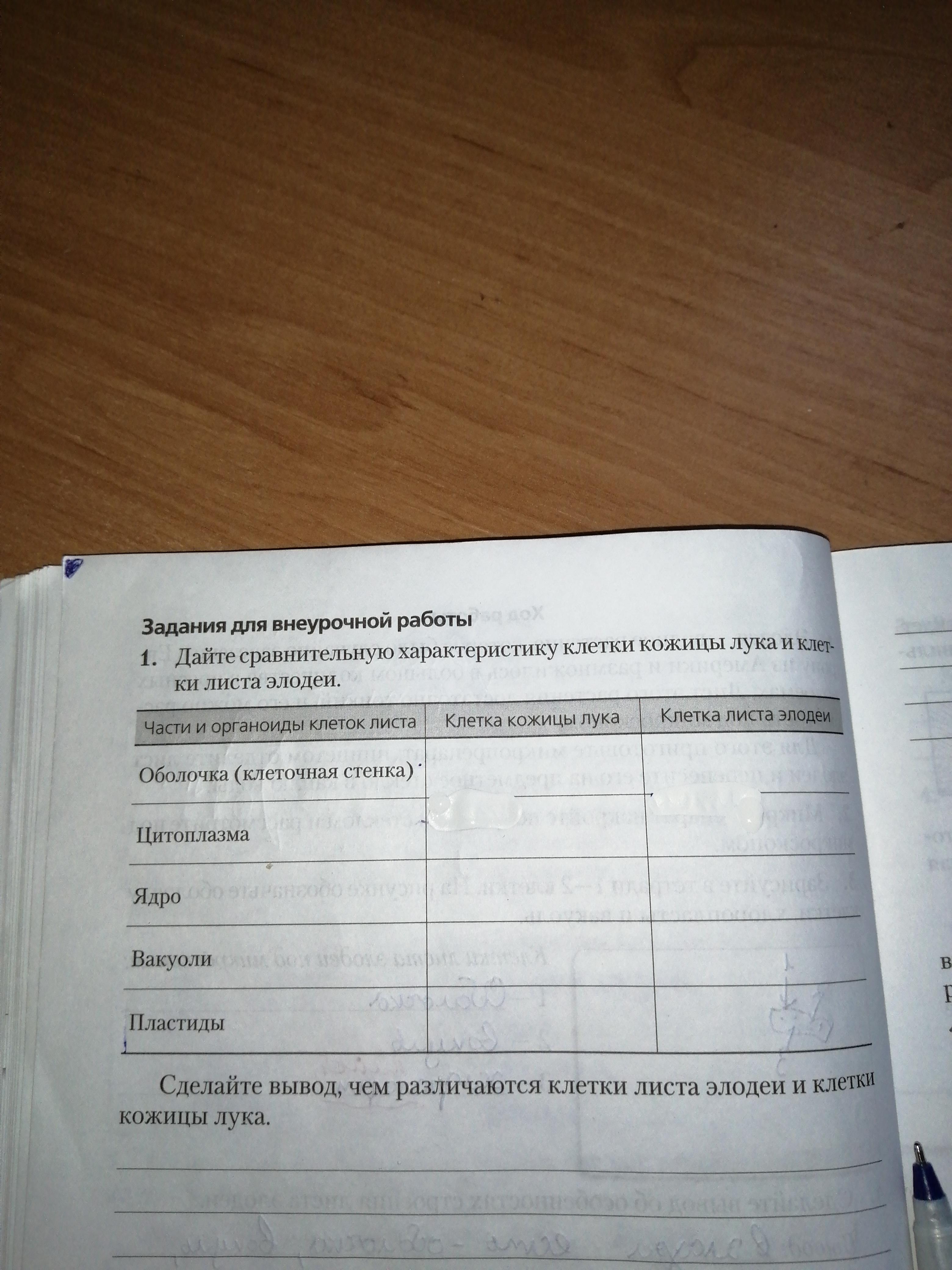 Ответ: Клетка листа элодеи имеет снаружи прозрачную и прочную оболочку. Она состоит в основном изклетчатки — органического вещества, подобного крахмалу. Оболочка защищает содержимое клетки от механических и других воздействий. Внутри клетки находятся цитоплазма, ядро, зеленые пластиды и обычно одна крупная вакуоль.
