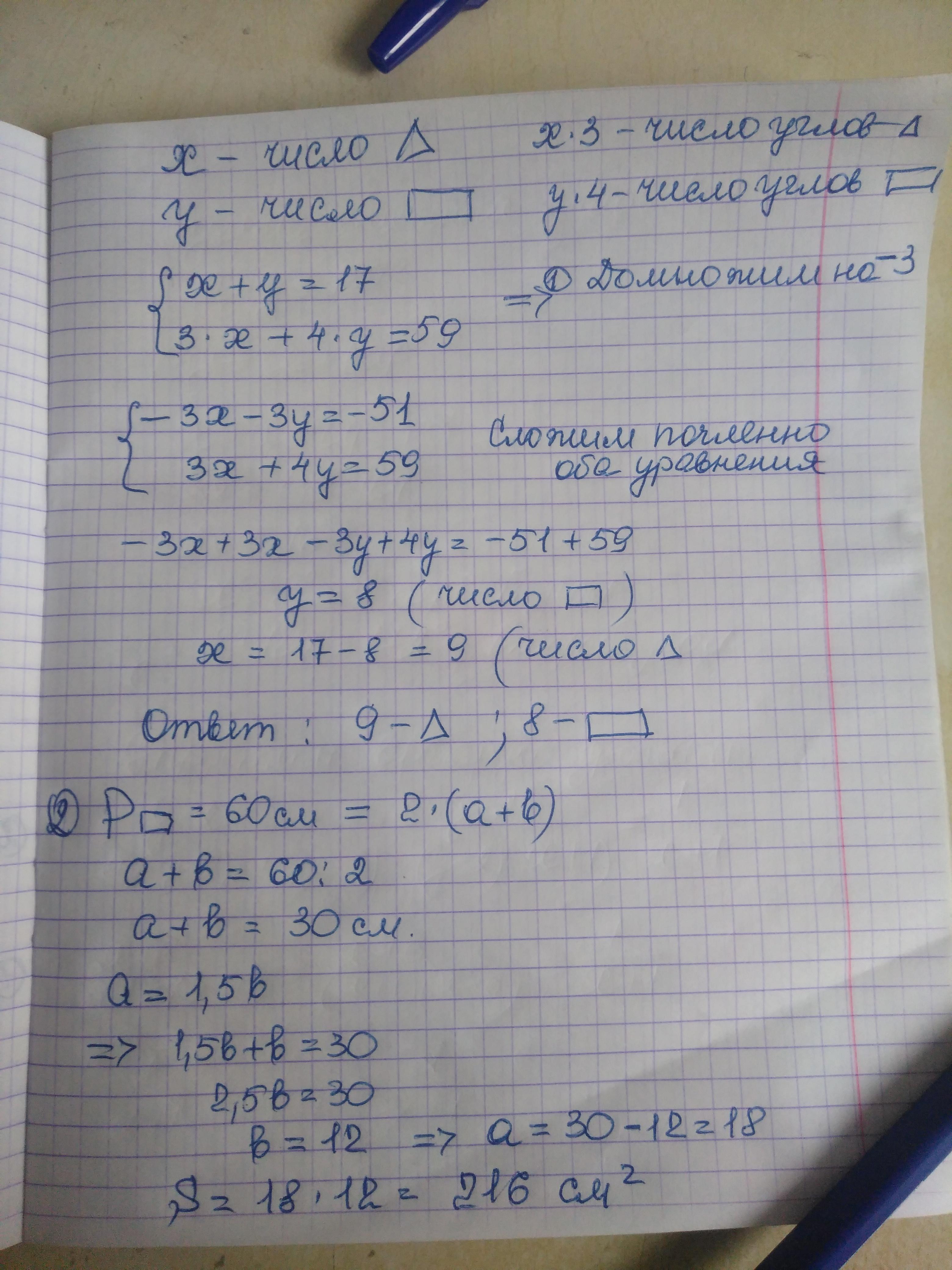 В кабинете математики имеется 17 моделей треугольников и прямоугольников,а число их углов равно 59.Сколько имеется в кабинете математики моделей прямоугольников и треугольников??