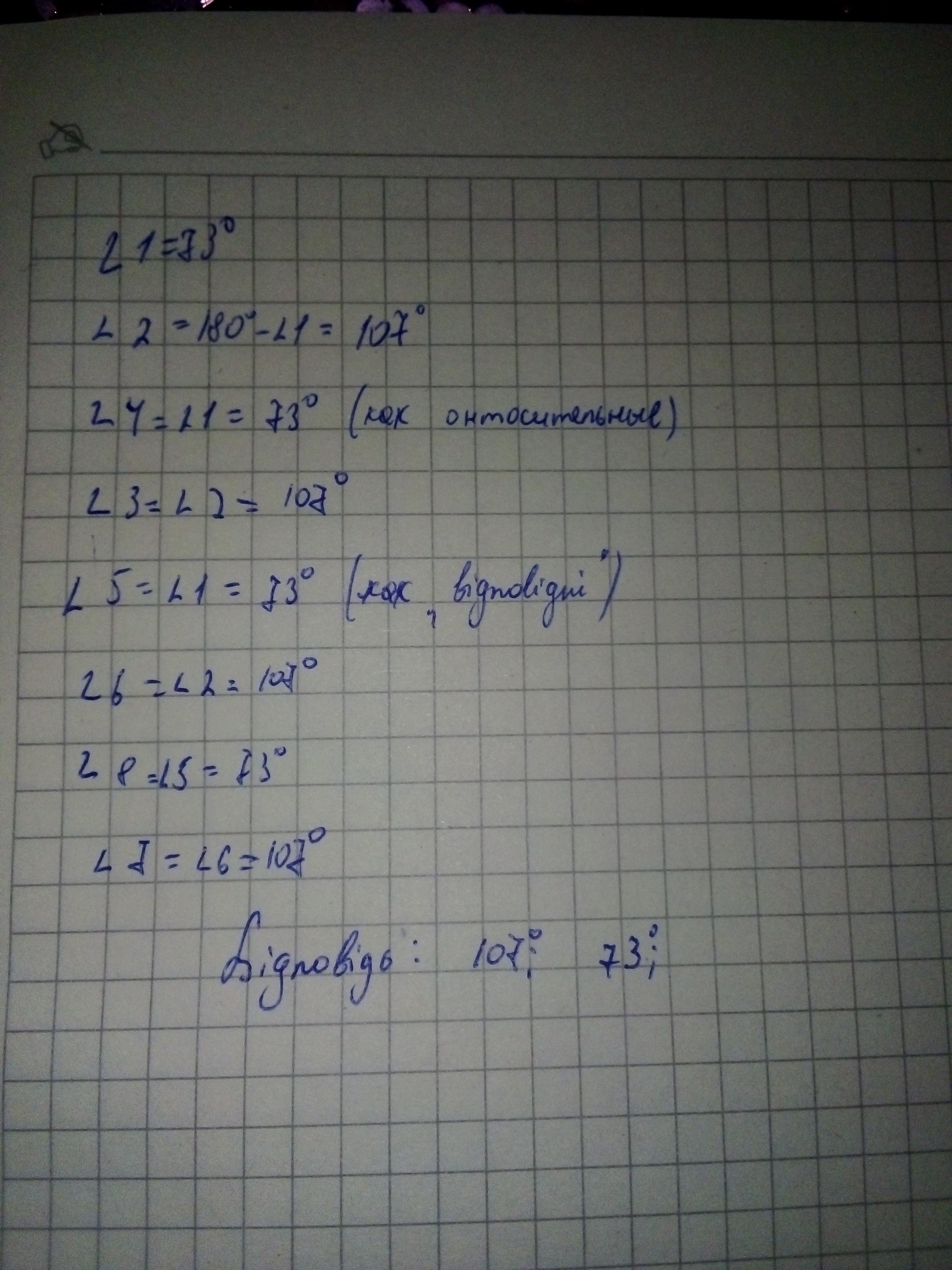 Найдите углы, образованные при пересечении двух прямых, если один из них равен 73°.
