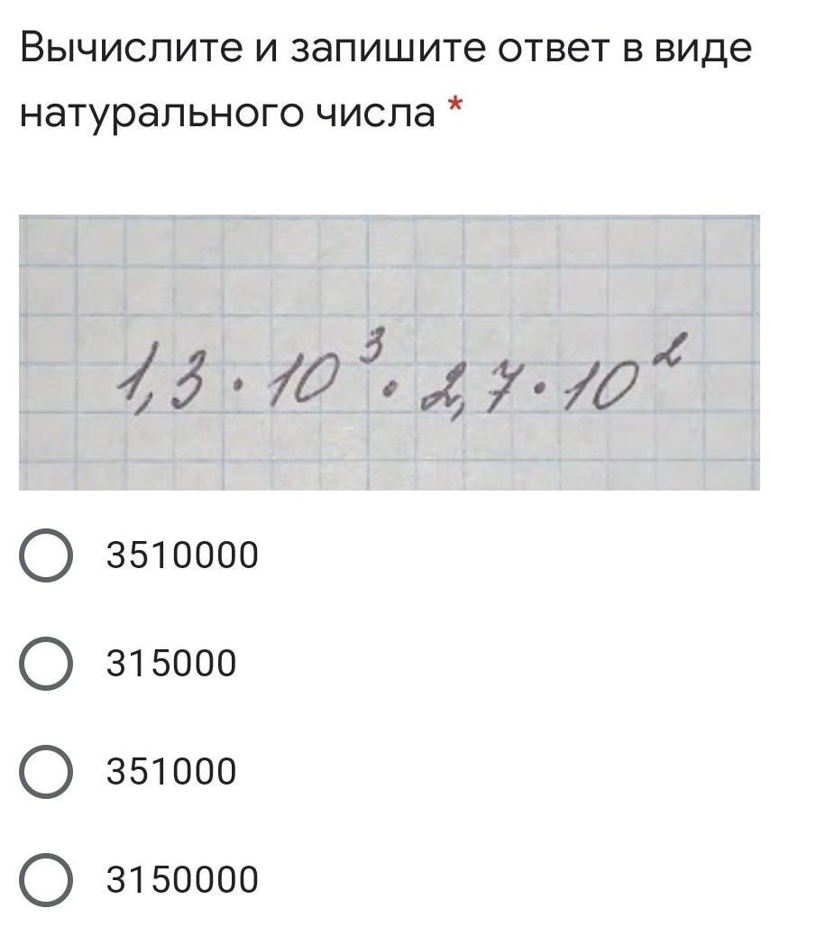 1,3*10³*2,7*10²= (1,3*2,7)*10³*10²=3,51*10^5= 3,51*100000=351000