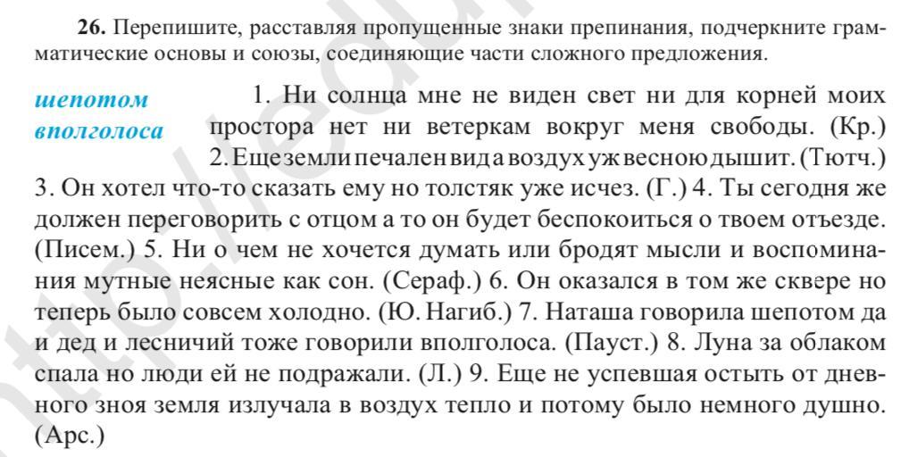 1.Ни солнца мне не виден свет, ни для корней моих простору нет, ни ветеркам вокруг меня свободы (Крыл.).2.Еще земли печален вида ,воздух уж весною дышит.3.Он хотел что-то сказать ему ,но толстяк уже исчез.4.Ты сегодня же должен переговорить с отцом ,а то он будет беспокоиться о твоём отъезде.5.Ни о чем не хочется думать ,или бродят мысли и воспоминания мутные неясные ,как сон.6.Он оказался в том же сквере ,но теперь было совсем холодно.7.Наташа говорила шепотом ,да и дел ,и лесничий ,тоже говорили вполголоса(точно не знаю)8.Луна за обломком спала ,но люди ей не подражали.9.Еще не успевшая остыть от дневного зноя ,земля излучала в воздух тепло и поэтому было немного душно.