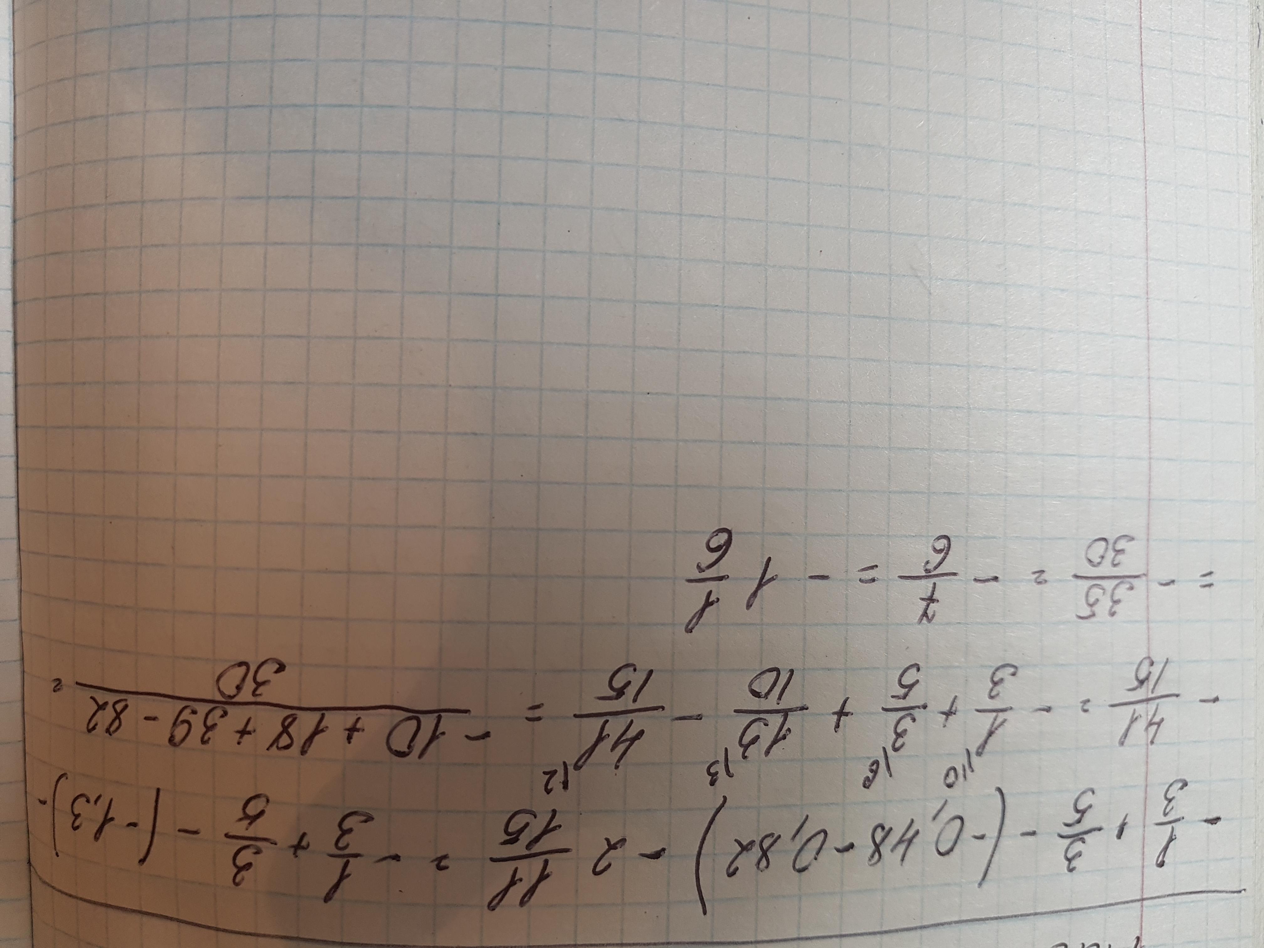 -1/3 + 3/5 - (-1,3) - 41/15 = - 1/3 + 3/5 + 1,3 - 41/15 = - 1/3 + 3/5 + 13/10 - 41/15 =