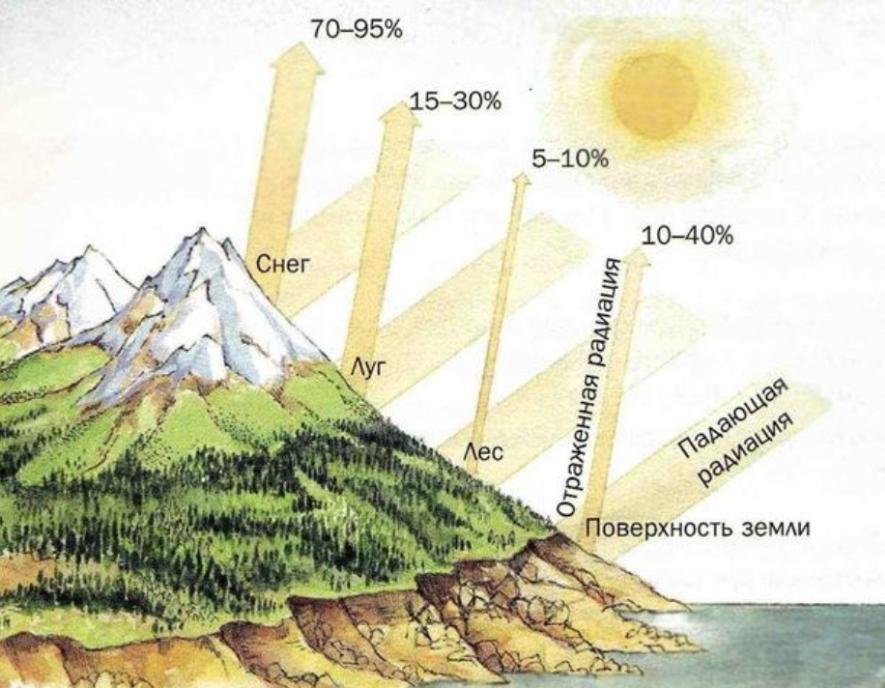 Чем светлее земная поверхность, тем больше отражается солнечных лучей.Так как чем темнее и неровней поверхность, тем меньше она отражает солнечных лучей, и наоборот, чем светлее и ровнее поверхность, тем больше она отражает.