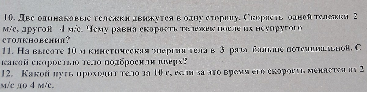 Так как тележки движутся в одну сторону и их удар был неупругим, то закон сохранения импульса в скалярном (в проекциях на ось ОХ) будет иметь следующий вид: mϑ1+mϑ2=2mϑ или ϑ1+ϑ2=2ϑ Отсюда: ϑ=(ϑ1+ϑ2)/2 Подставить данные из условия и решить.