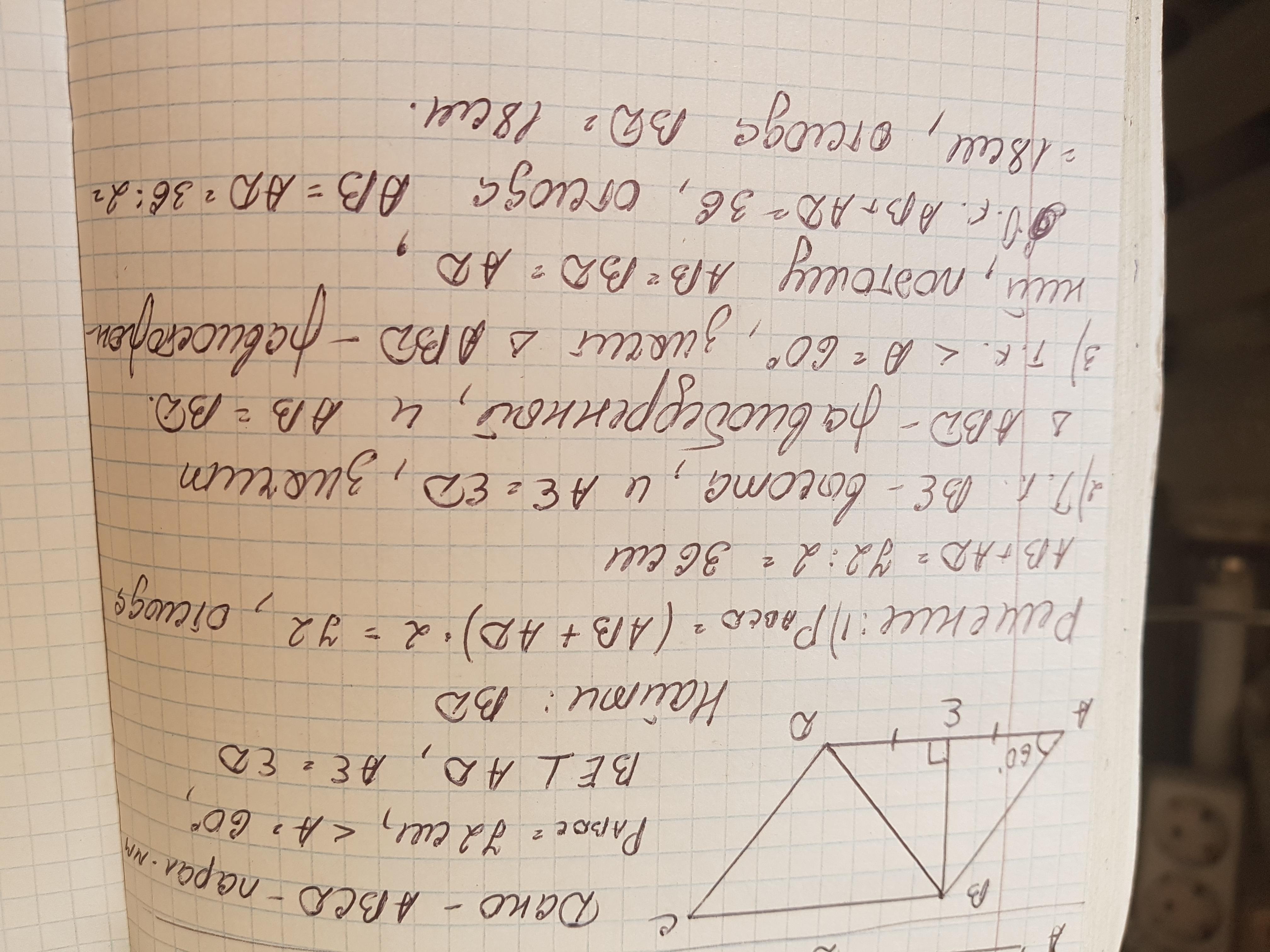 В параллелограмме ABCD угол А равен 60°. Высота ВЕ делит сторону AD на две равные части. Найдите длину диагонали BD, если периметр параллелограмма равен 72 см.