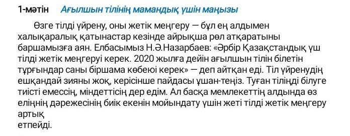 1 тапсырма•Мәтінді оқып шығып, көтерілген басты мәселені анықтаңыз.Өз көзқарасыңызды жан-жақты тұжырымдап, мысалдар арқылы дамытып дәлелдепңіз.Мәттіннің мазмұны бойынша маңызды деп санайтын 3 сұрақ құрастыр.