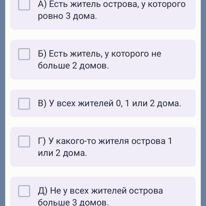 Приехав на остров, путешественник воскликнул: «Да тут у каждого жителя острова не меньше 3 домов!». Однако оказалось, что он ошибся. Какие из утверждений обязательно верны?