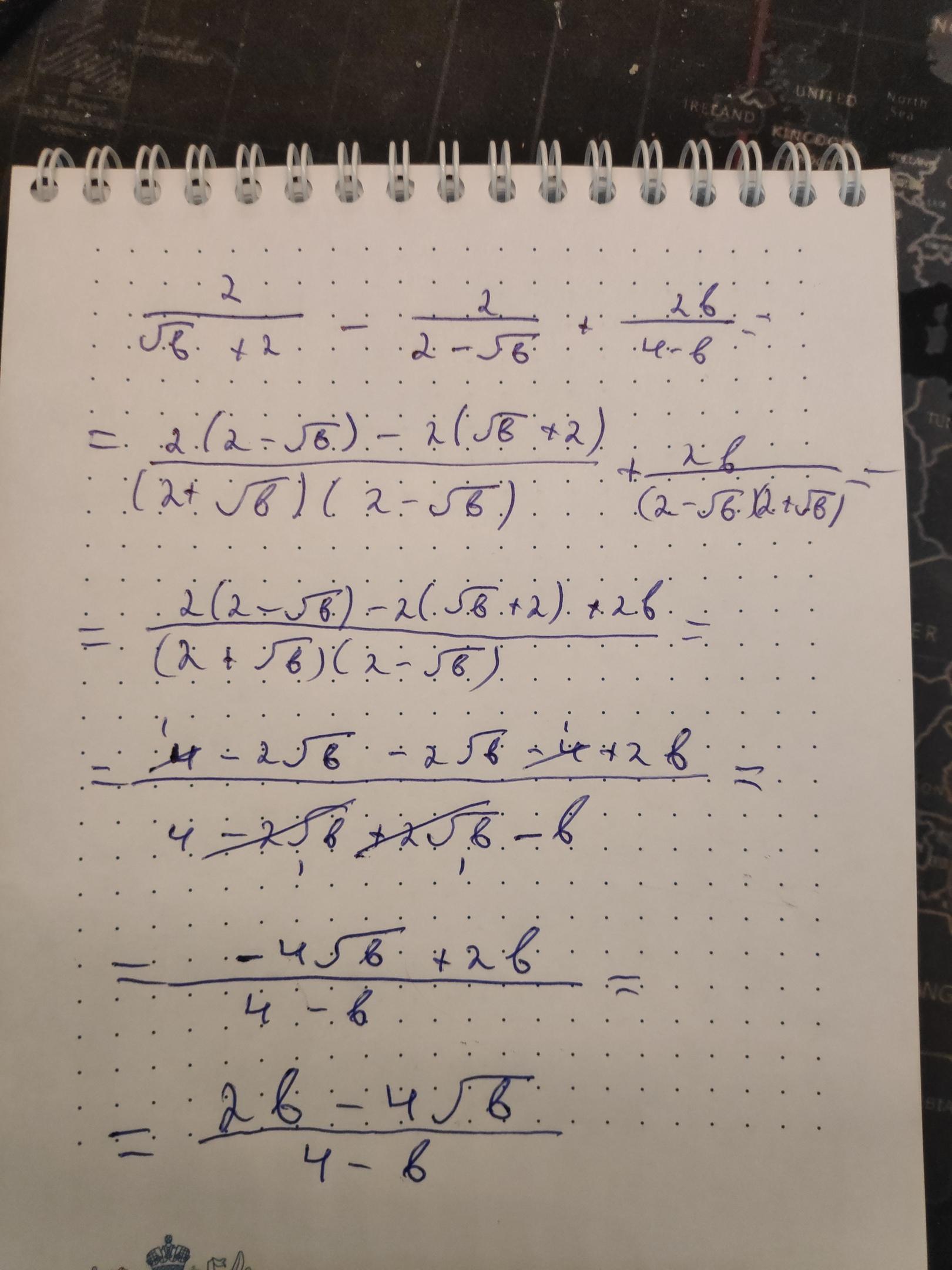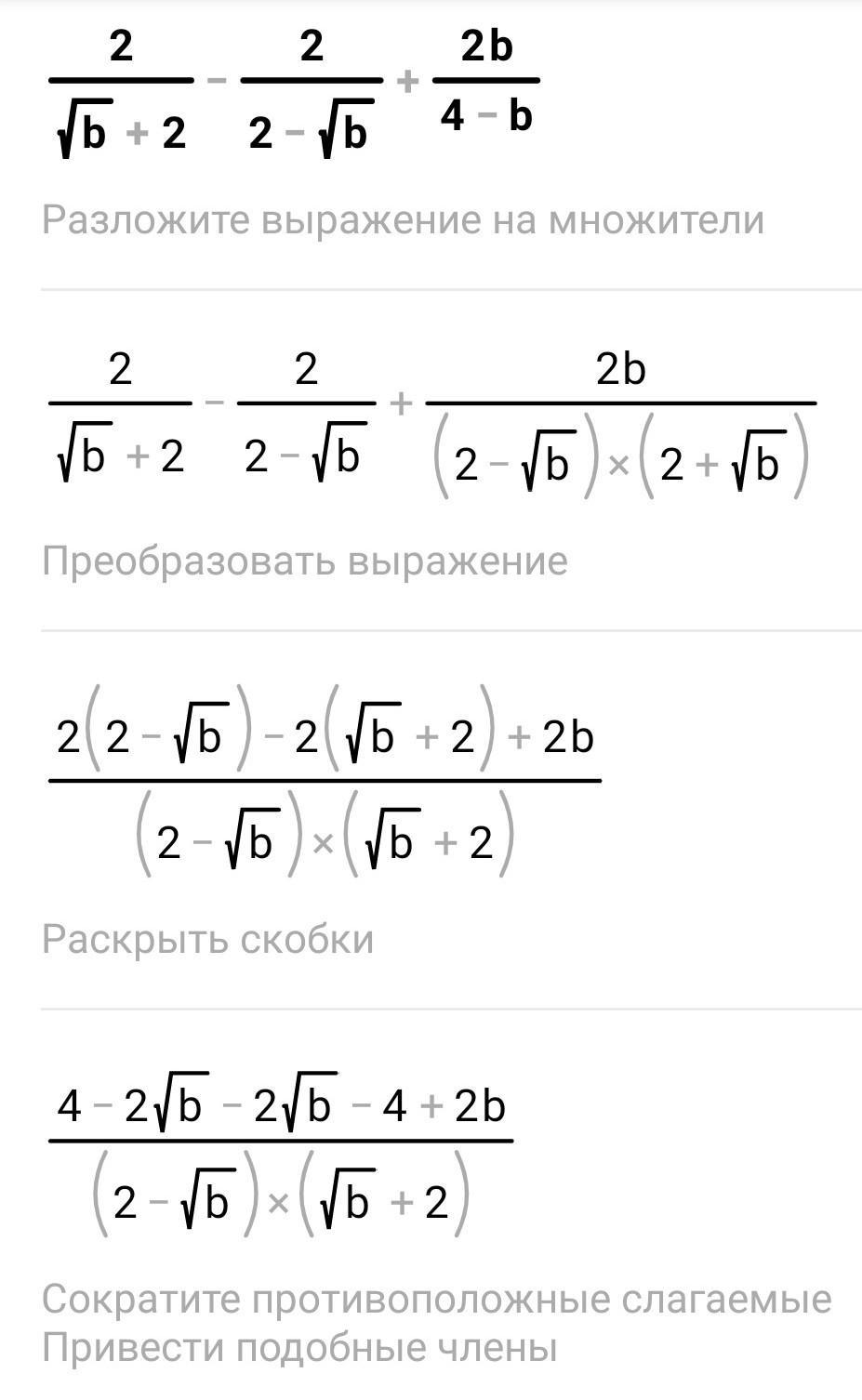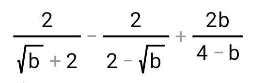 Неполное решение. Знаменатель можно разложить на (2-√b) (2+√b), а числитель представить как 2√b(√b-2), после сократить