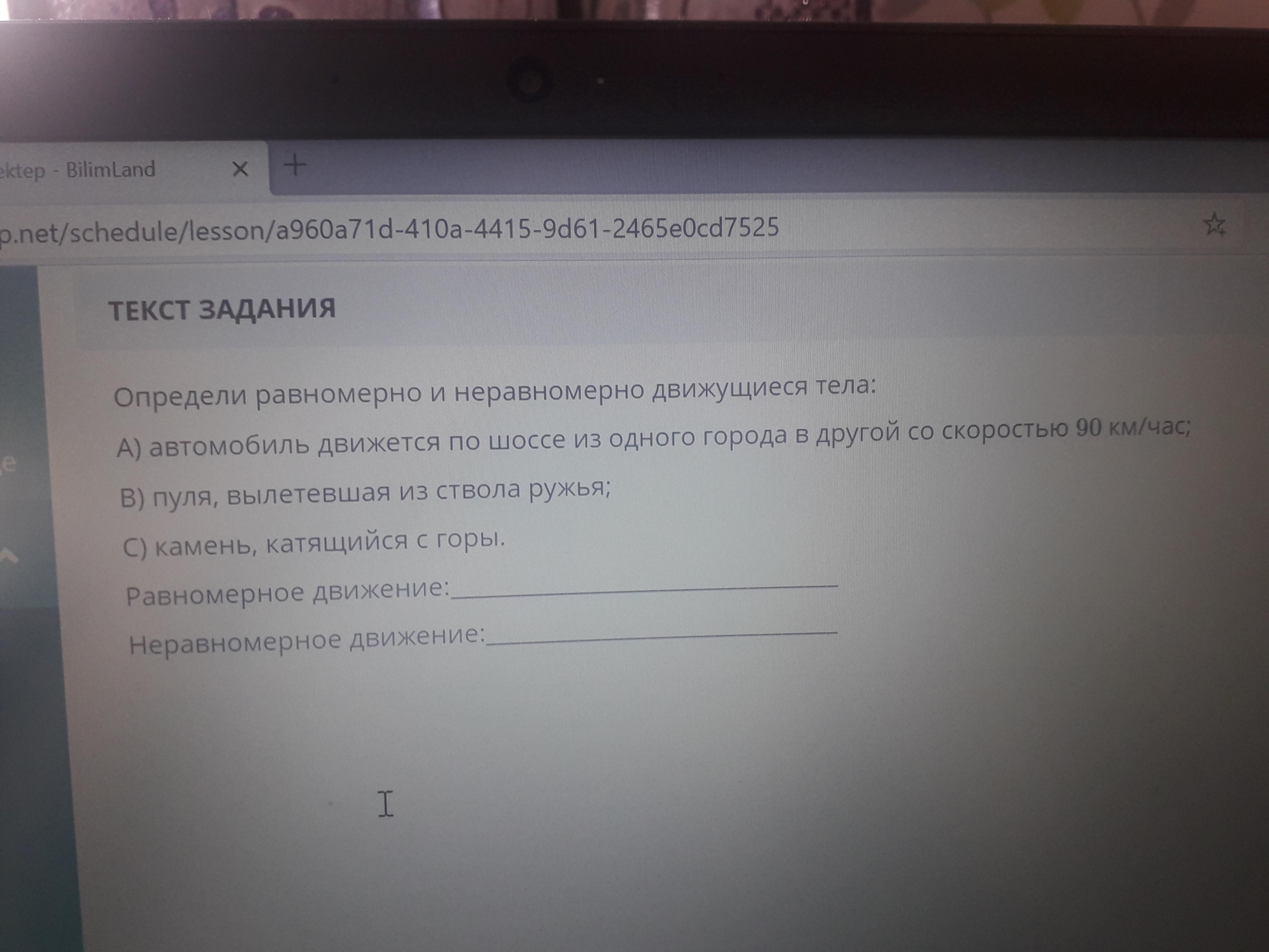Определи равномерно и неравномерно движущиеся тела: А) Автомобиль движется по шоссе из одного города в другой со скоростью 90км/час; В) пуля, вылетевшая из ствола ружья ; С) Камень,светящийся с горы.