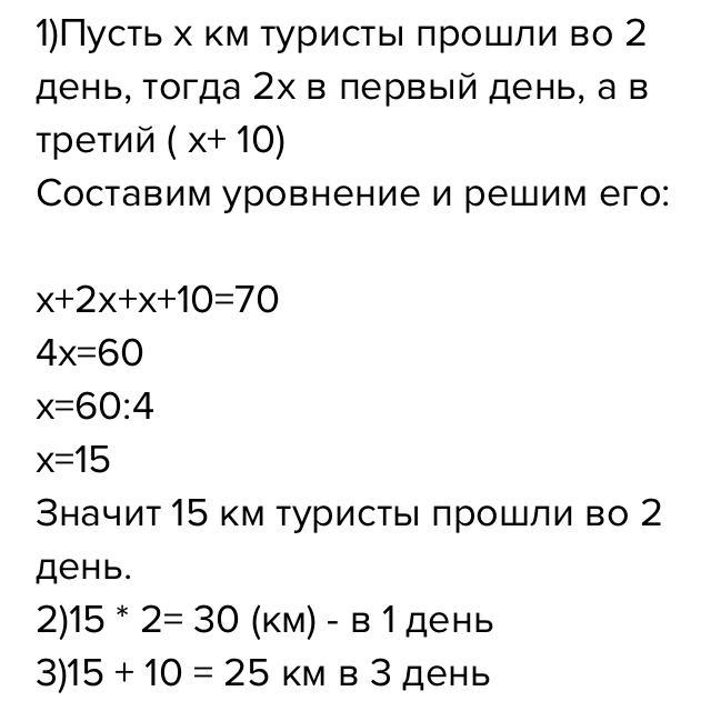За три дня туристы прошли 70 км. В первый день туристы прошли в 2 раза больше,чемво второй день,а в третийна 10 км больше,чем во второй. Какой путь был пройден туристами в каждый день
