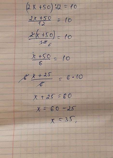 решите уровнение и сделайте проверку (2х+50)÷12=10