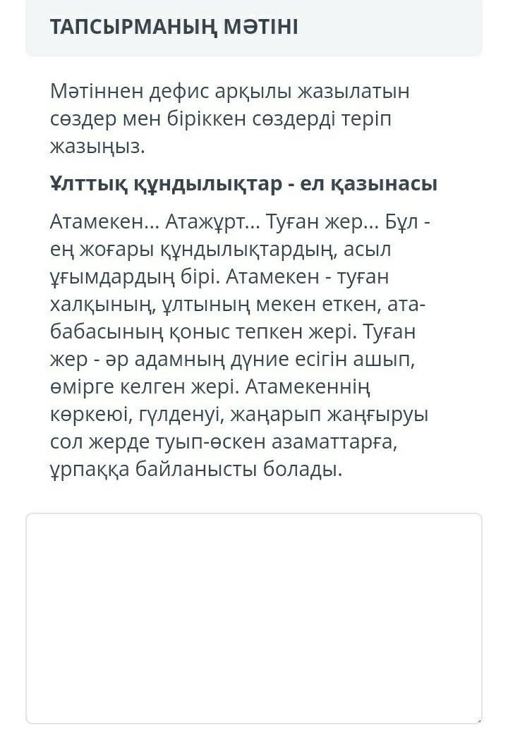 Мәтіннен дефис арқылы жазылатын сөздер мен біріккен сөздерді теріп жазыңыз. Ұлттық құндылықтар ел қазынасы. Атамекен... Атажұрт... Туған жер... Бұл ең жоғары құндылықтардың...и т.д