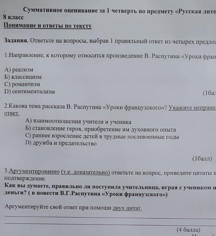 направление к которому относится произведение Распутина уроки французского реалистик класизм реманиищм сентемантизм