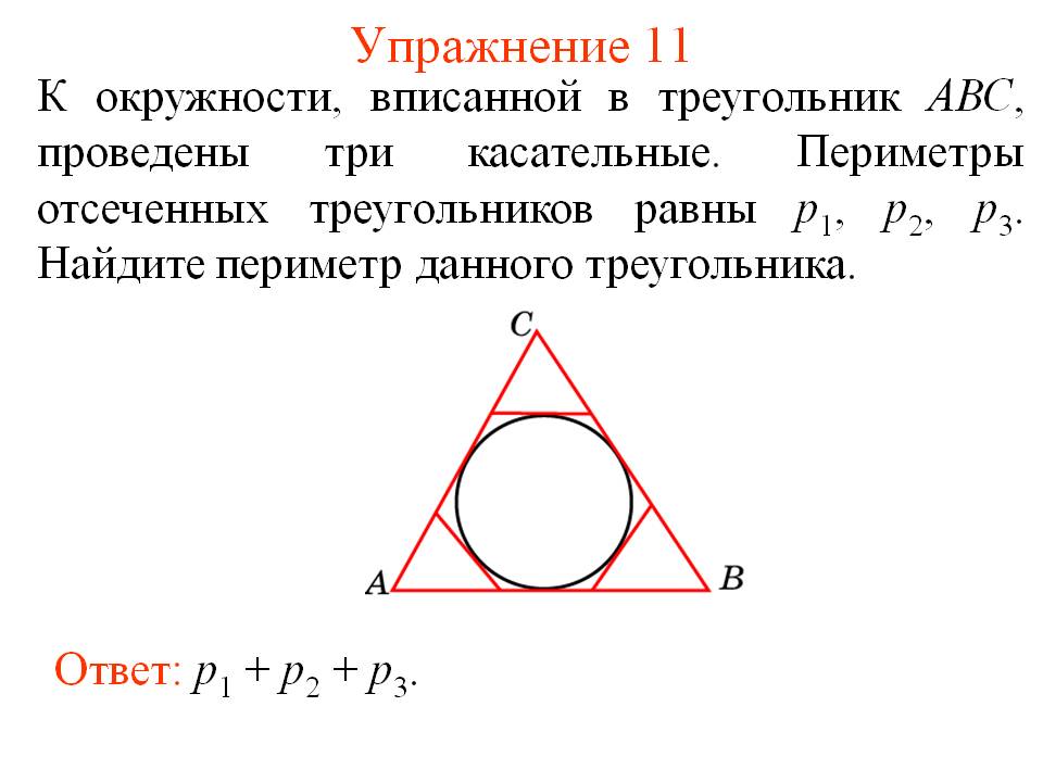 Даю много баллов!!! к окружности, вписанной в треугольник авс, проведены три касательные. периметры отсеченных треугольников равны p1,p2,p3.Найдите периметр данного треугольника