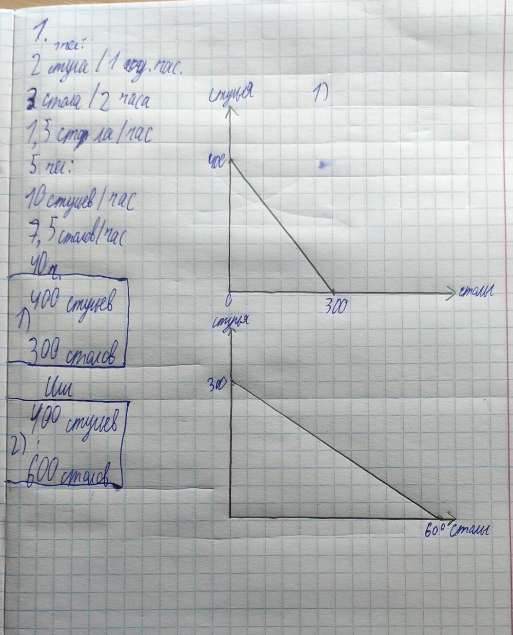 Технологія дозволяє виробляти 2 стільці за одну годину і 3 столи за дві години. Визначити: - який вигляд має крива виробничих можливостей бригади із п’яти осіб в межах 40-годинного робочого тижня; - яка альтернативна вартість одного стільця і одного стола; - як зміниться крива виробничих можливостей, якщо витрати часу на виробництво 1 стола скоротяться вдвічі?