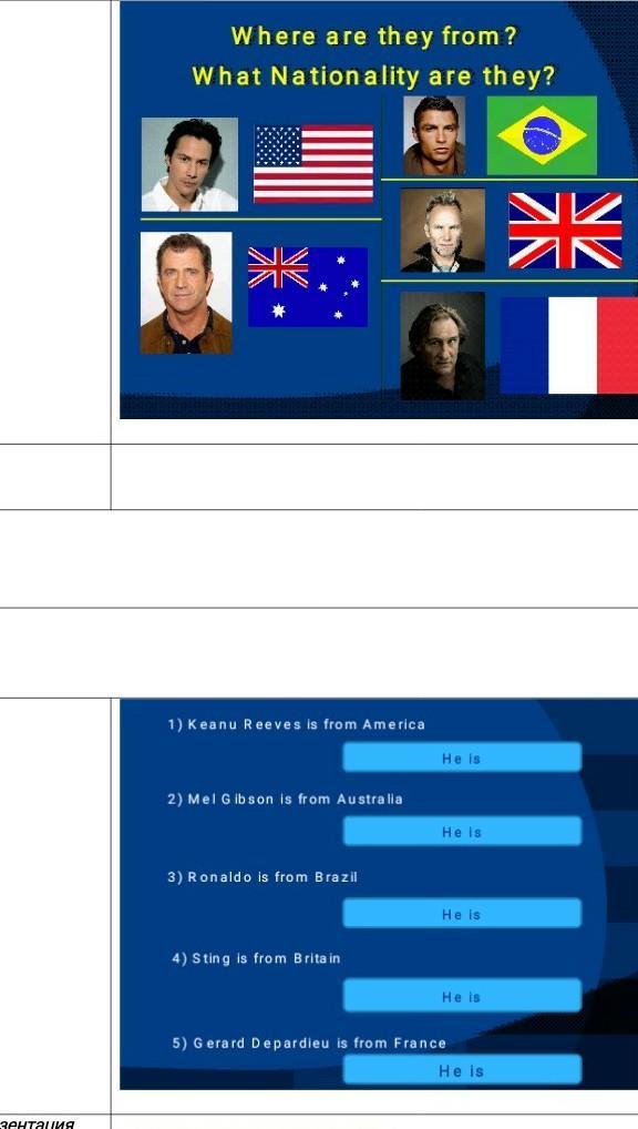 100 баллов 1)keanu reeves in from america he is mel gibson is from australia. he is. ronaldo is from brazil. he is. sting is from britain he is. gerard depardieu is from france he is