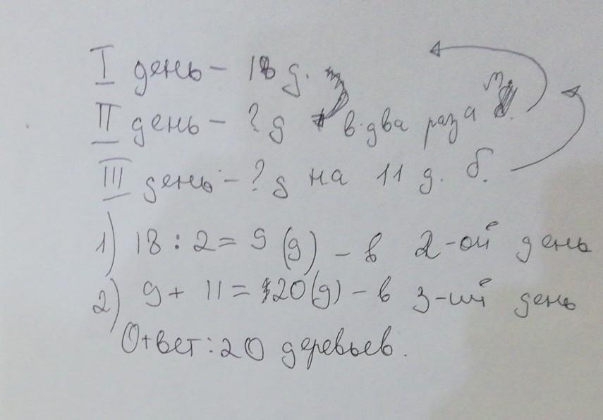 1) 18/2=9(дер) 2 день 2) 11+9=20(дер) Ответ 20 деревьев в третий день
