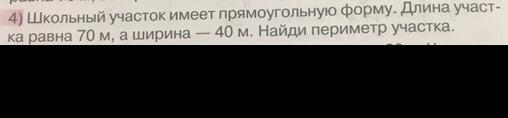 Школьный участок имеет прямоугольную форму. Длина участка равна 70 м, а ширина 40 м. Найди периметр участка