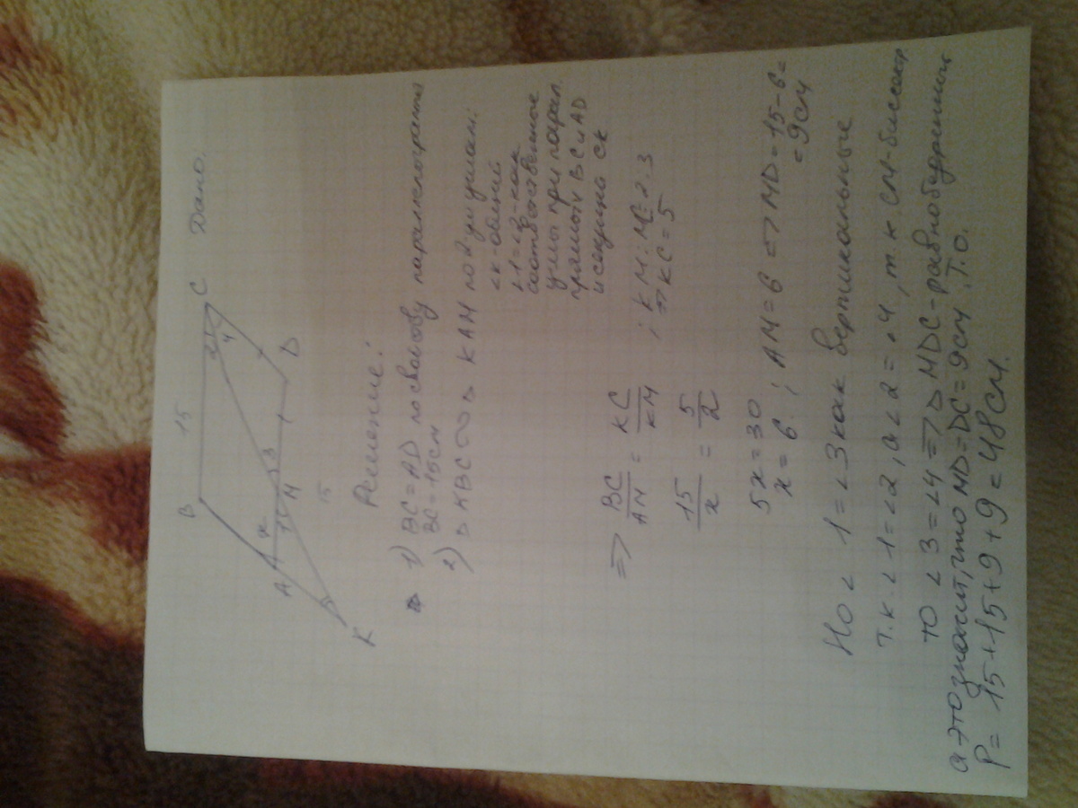 В параллелограмме ABCD биссектриса острого угла C пересекает сторону AD в точке M, а продолжение стороны AB в точке K, KM : MC = 2: 3. Найдите периметр параллелограмма ABCD, если AD равен 15 см.