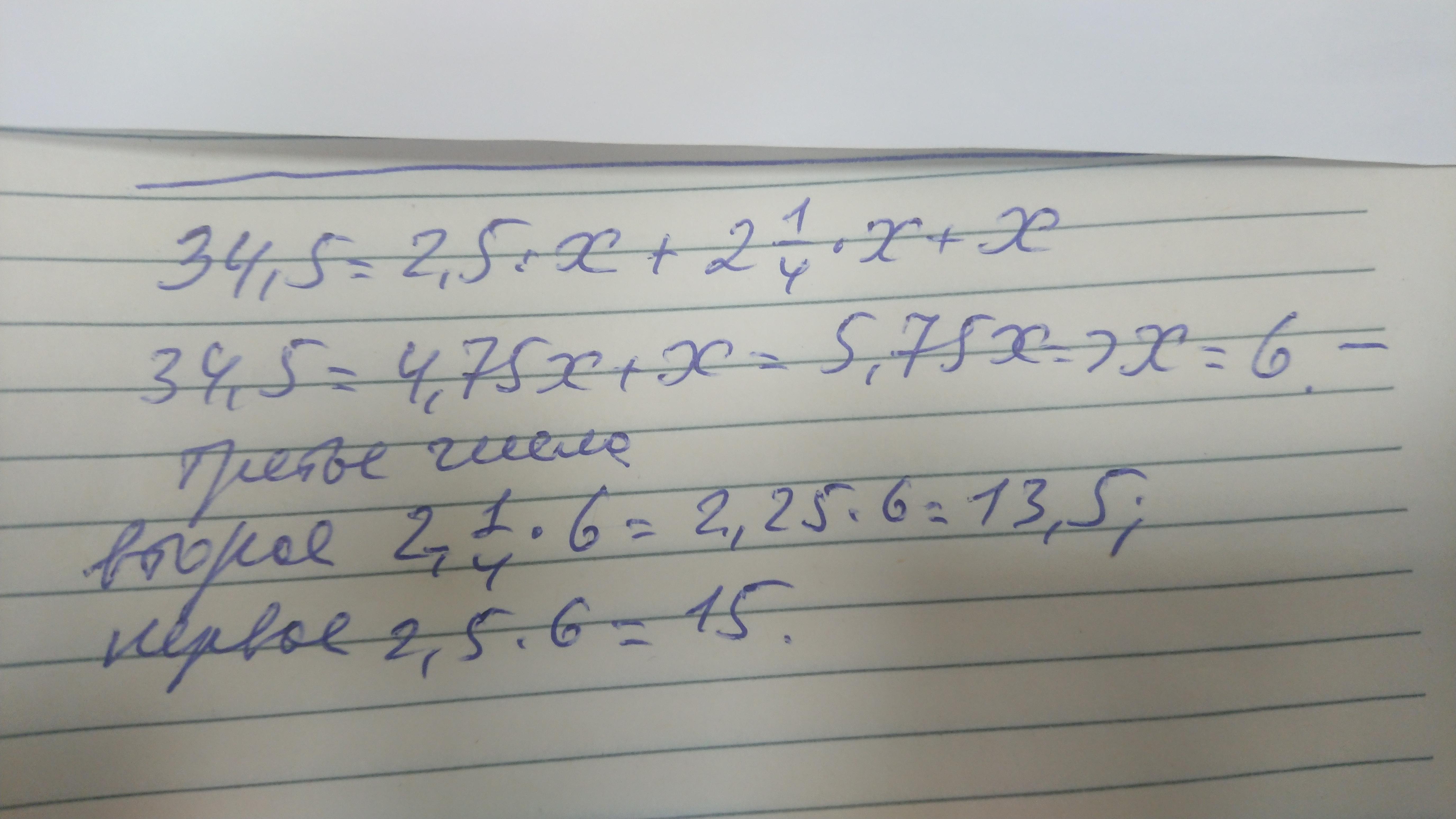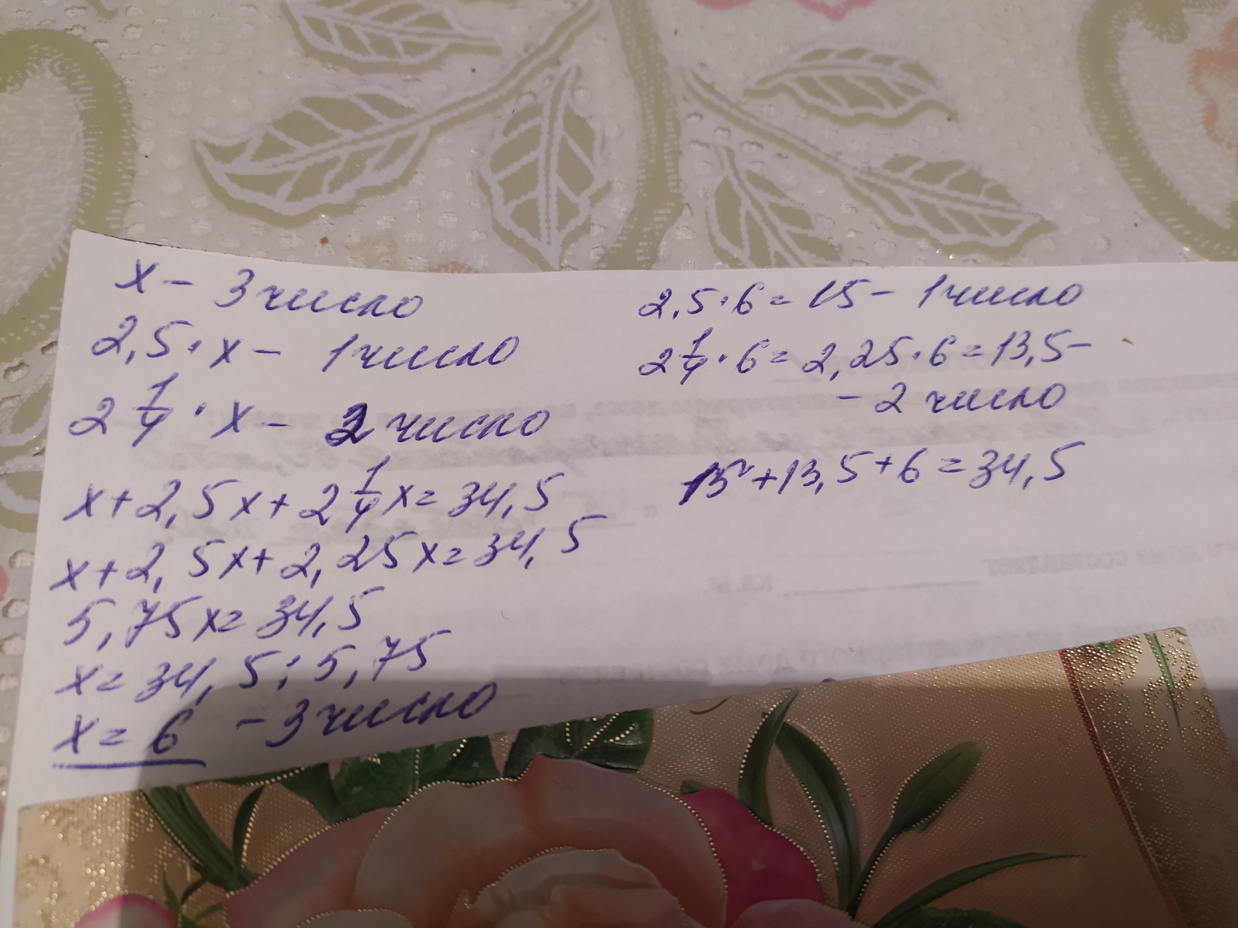 Сумма трьох чисел дорівнює 34,5. Перше число в 2,5 більше від третього, а друге в 2 1/4 рази білше від третього. Знайди ці числа