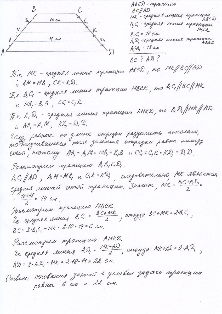 Средняя линия данной трапеции разбивает её на две трапеции, средние линии которых равны 10см и 18см. Найдите основания данной трапеции