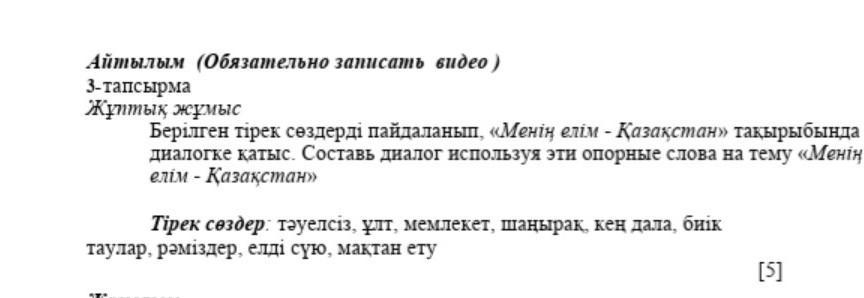 Менің Қазақстаным тәуелсіз ел. Біздің еліміз тату көп ұлтты ел. Қазақстанға көптеген мемлекеттерден туристтер келеді. Біздің елдің шыңырақтарына көп қонақ келеді. Ата-бабаларымыз бізге кең даланы аманат етіп кетті.