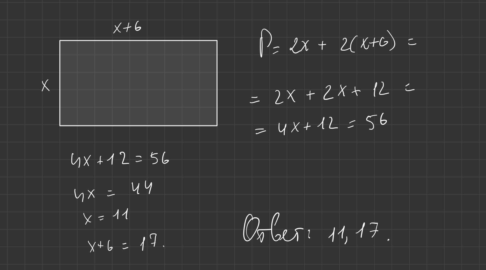 Одна сторона прямоугольника на 6 см больше другой. Периметр равен 56 см.