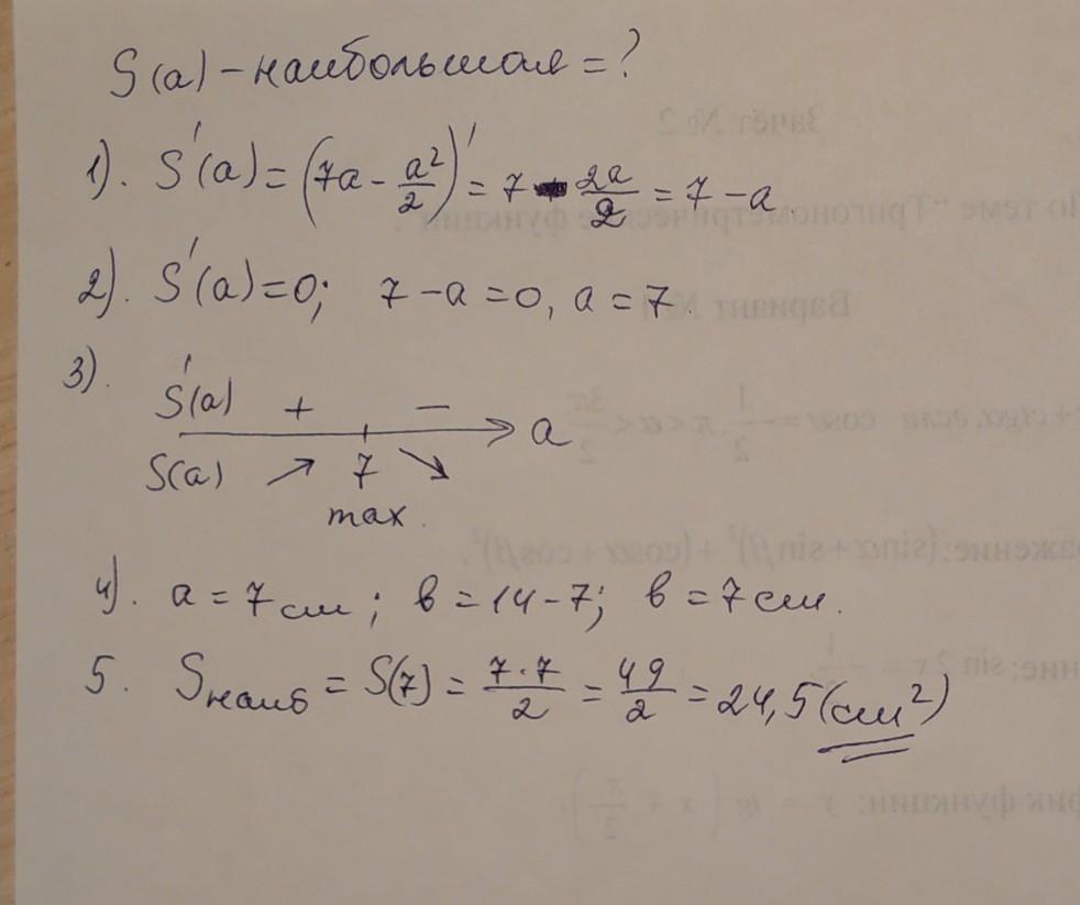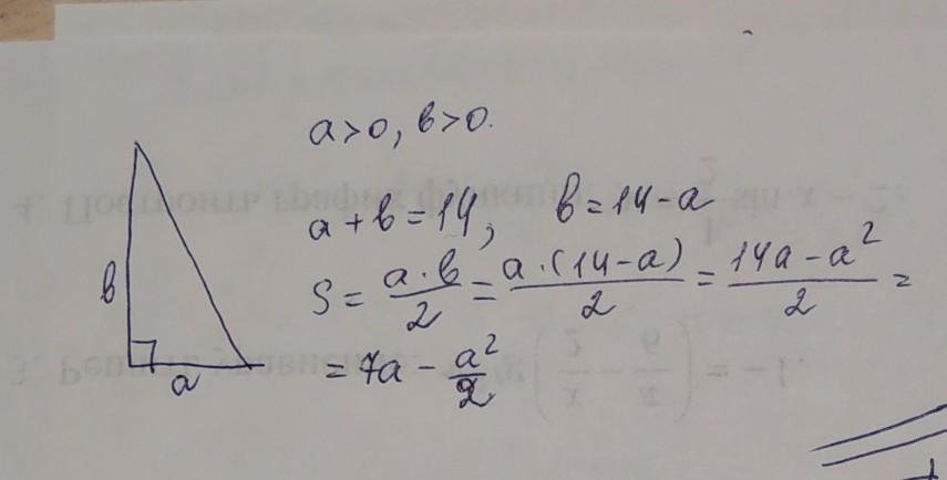 Сумма катетов прямоугольного треугольника равна 14 см. Найди длины катетов этого треугольника, при которых площадь треугольника будет наибольшей.