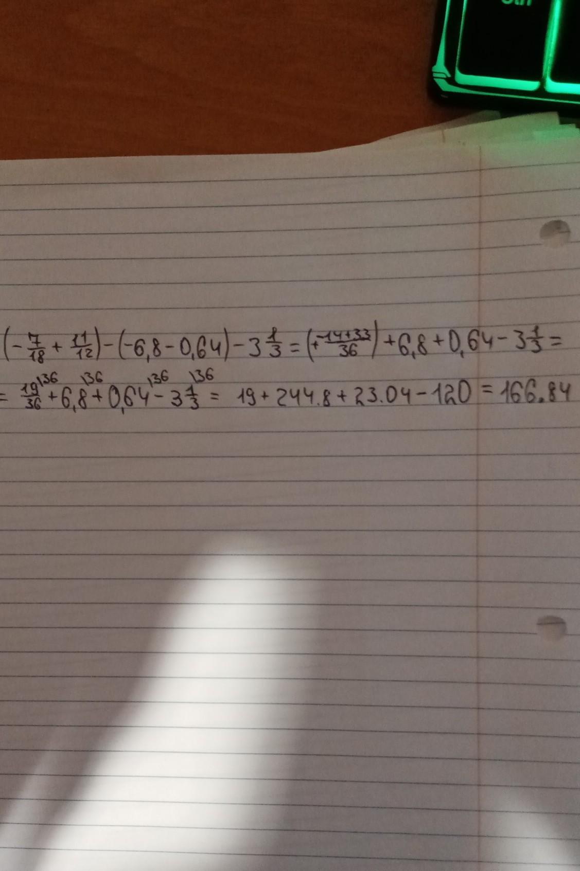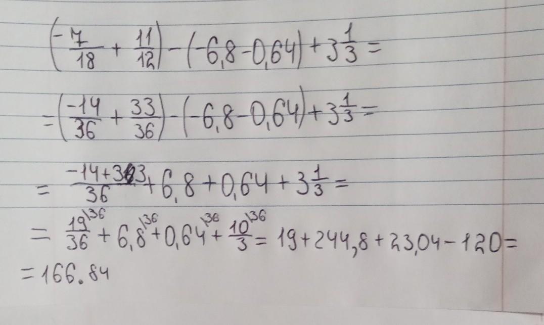 Сначала мы находим общий знаменатель потом, Мы открываем все скобки и пробуем подвести к простым числам а потом их прибавляем и у нас получается 166. 84