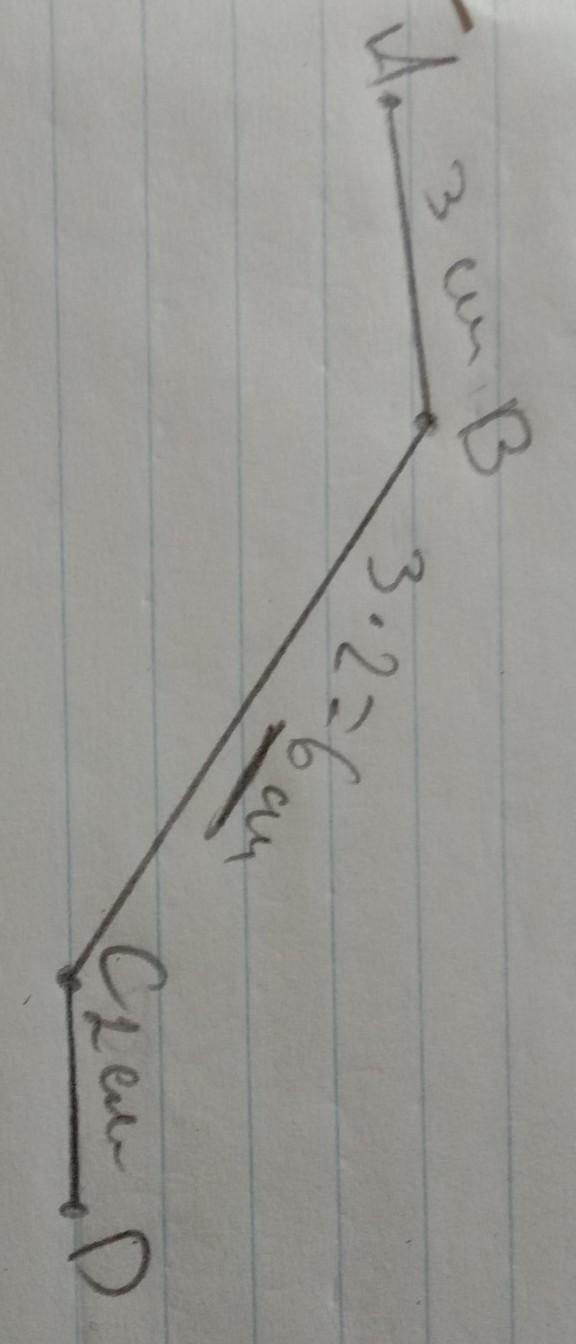 Начерти ломаную ABCD у которой Длина первого звена 3 см второго звена в два раза больше длины первого а длина третьего 2 см