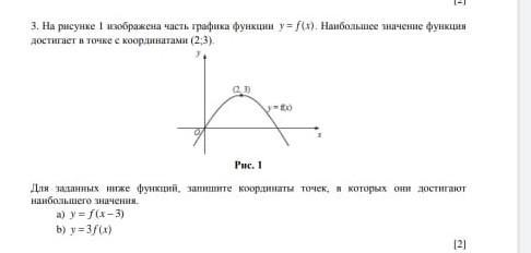 На рисунке 1 изображена часть графика функции y=f(x). Наибольшее значение функция достигает в точке с координатами (2;3)