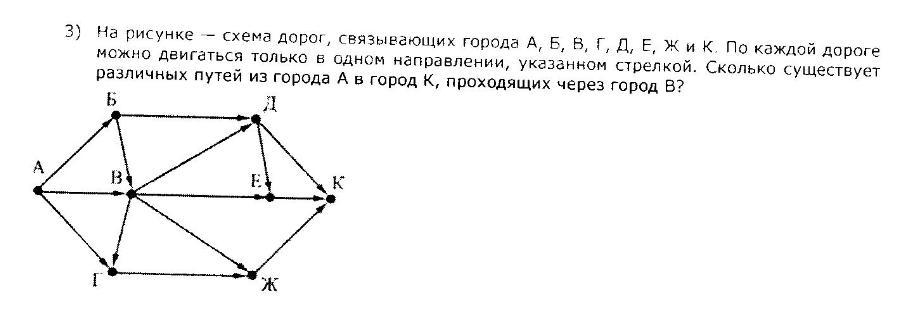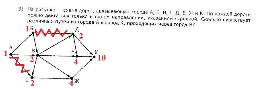 10 путей из города А в город К, проходящих через город В