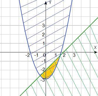 Точки плоскости, заданные первым неравенством, лежат выше параболы y = x² - 3, график которой получается смещением графика функции y = x² на 3 единицы вниз (синий график).